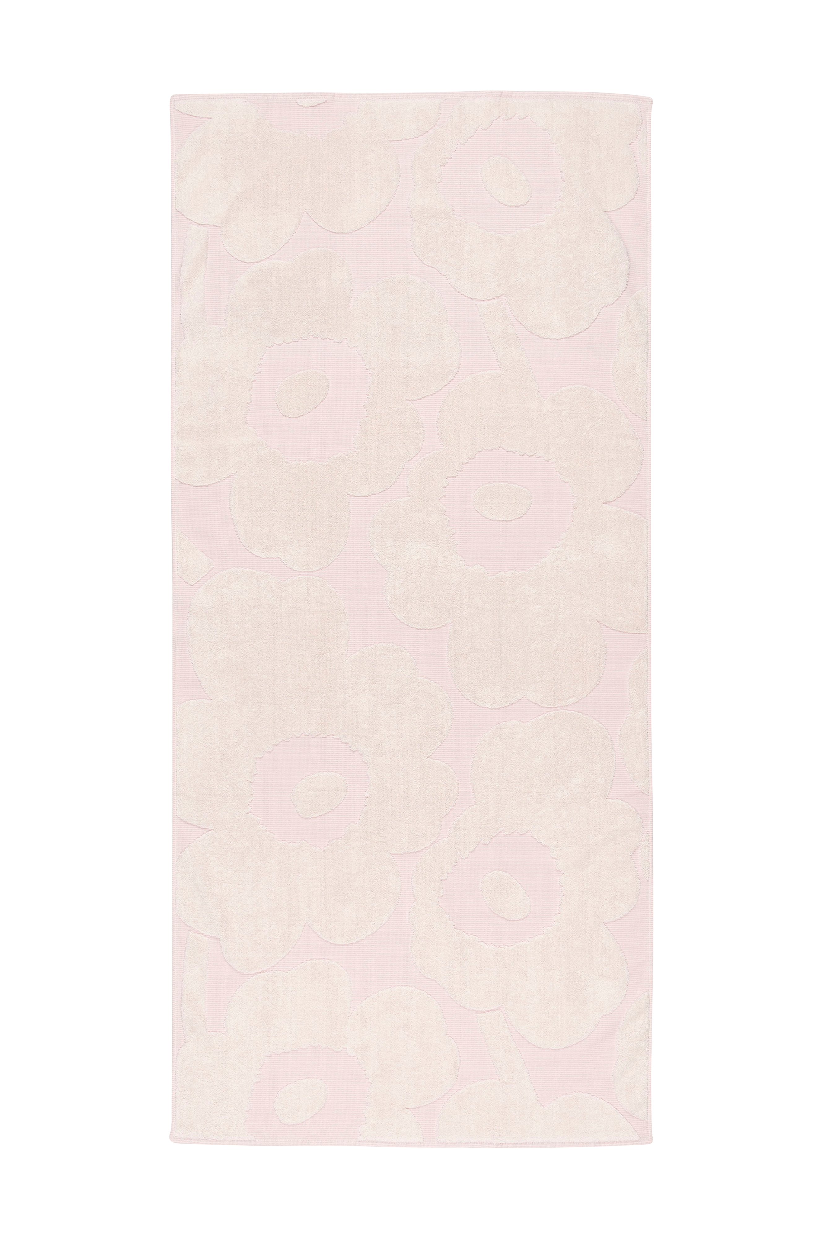 Badehåndklædet med det prægede Unikko -mønster er lavet af økologisk bomuldsfrotté. Bagsiden af håndklædet er glat. Unikko symboliserer kreativitet, og det blev født i en tid, hvor der næsten ikke var nogen blomsterdesigns i Marimekkos kollektioner. Maija Isola var imidlertid fascineret af blomstertemaet og besluttede at skabe en hel serie af nye blomsterprint.