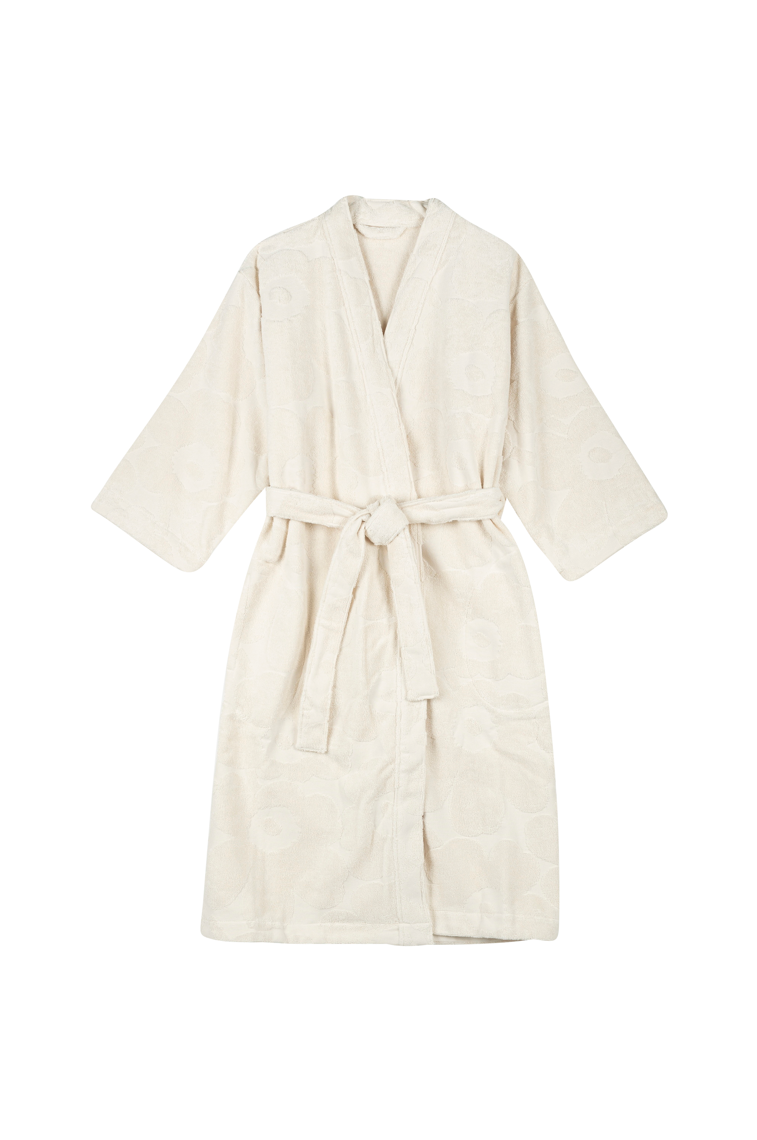 Denne badekåbe i økologisk bomuldsfrotté er dekoreret med mønsteret Pieni Unikko . Kåben har store lommer foran og et aftageligt bælte. Marimekkos berømte mønster Unikko blev født i 1964 i en tid, hvor designhusets kollektioner mest bestod af abstrakte print. Designeren Maija Isola ønskede at skabe noget interessant ud fra dette organiske tema og designede en hel serie af blomsterprint. I dag repræsenterer den ikoniske blomst kreativitet.