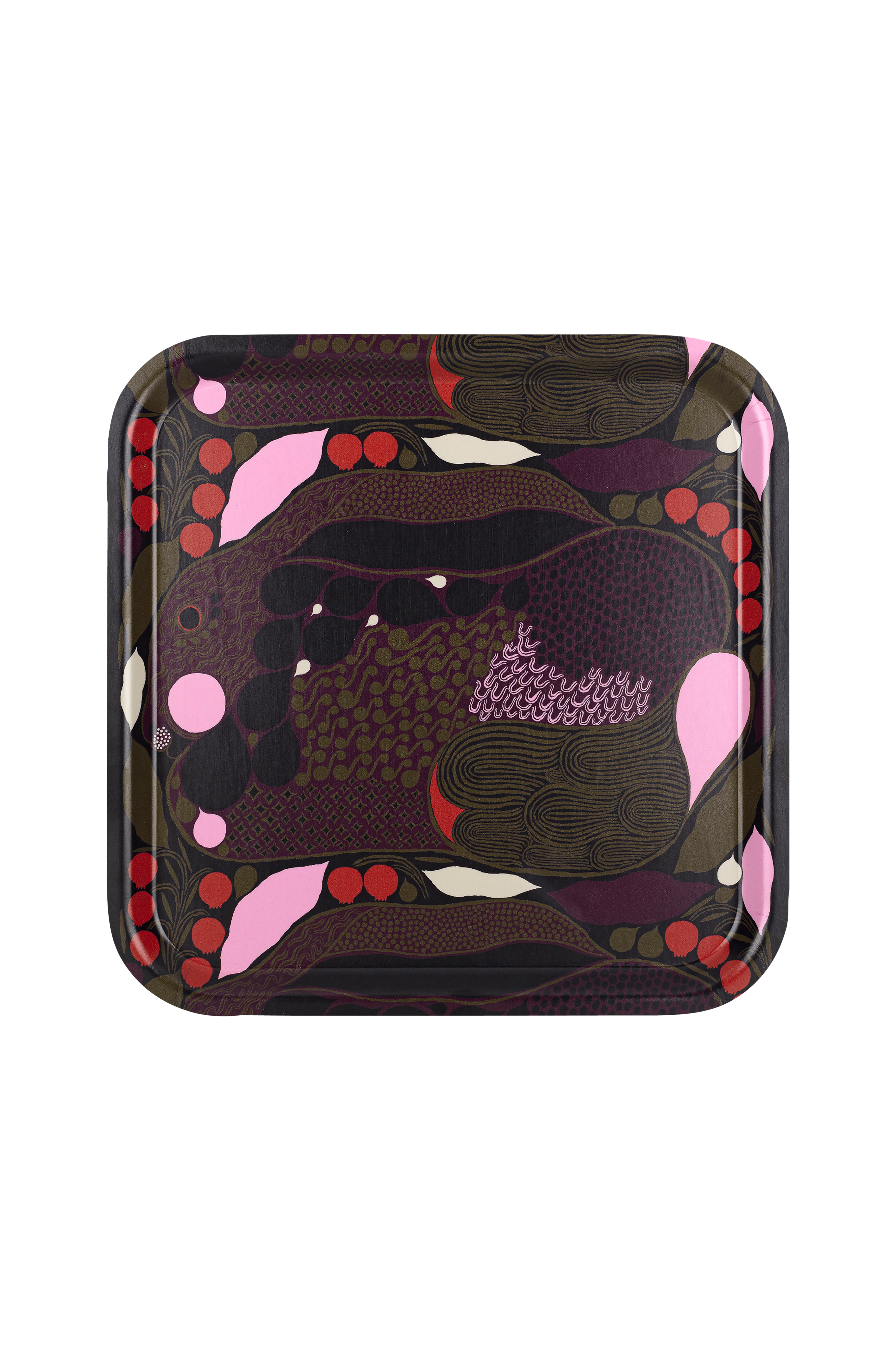 Let bakke i lamineret plywood af birk med Rusakko-mønster. Bagsiden af bakken har træets naturlige farve. En stor, brun hare kryber sammen ved en busk, omgivet af naturens smukke farver. På vagt og opmærksom er den klar til at springe væk. Rusakko-mønsteret (brun hare) er en moderne version af et folkloristisk tema, og fortsætter med at fortælle Aino-Maija Metsolas historier fra skoven. Mønsteroriginalen blev tegnet på papir med en tusch og pensel og derefter farvelagt ved hjælp af en computer.