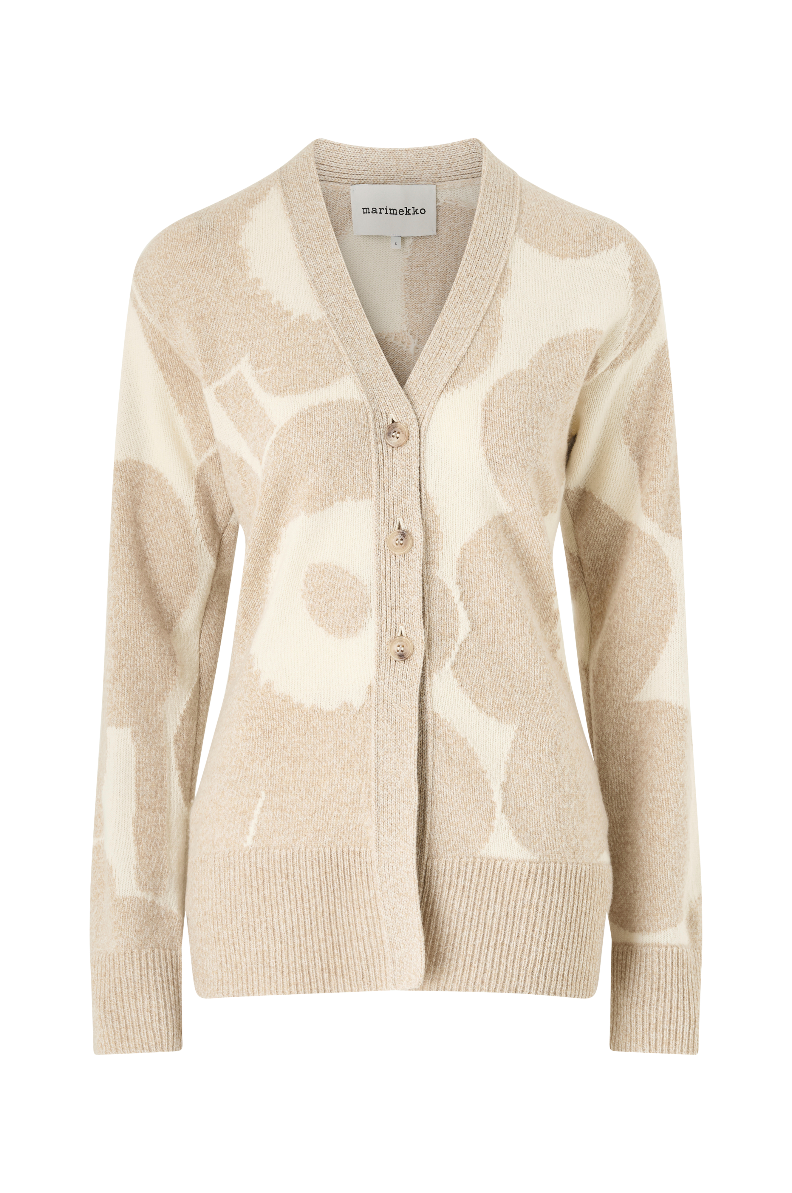 Den uldstrikkede cardigan fra Kumma har en slank, lige pasform. Den mønstrede Unikko cardigan er lavet med intarsia-strikning, som giver strikken en livlig overflade. Den har en dyb V-hals, en tredobbelt knaplukning og lange, løse ærmer. Ærmeenderne og kanten forneden har brede ribkanter.