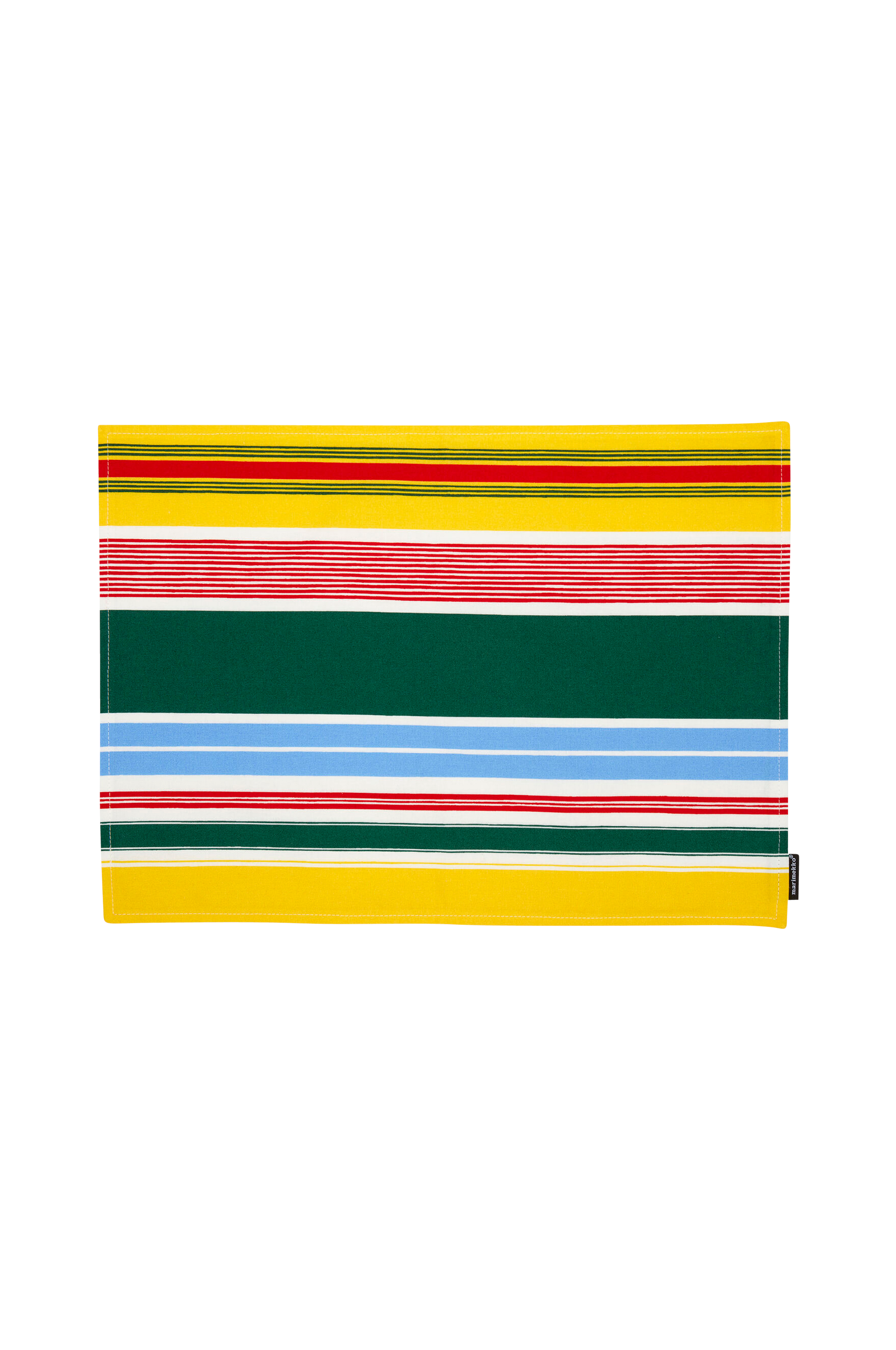 Dækkeserviet som er lavet af 100% genindvundet polyester i Paraati-mønsteret. Dækkeservietten er til udendørs brug og har en vandafvisende overflade samt en UV-beskytte finish som hjælper med at holde farverne flotte længere. Nem at tørre af med en fugtig klud. Striber har altid været afgørende for Marimekko-mønstrenes verden. Paraati (parade) er et friskt, stribet mønster af Fujiwo Ishimoto, der skildrer livsglæden med skiftende striber af forskellig tykkelse og fire forskellige farver.