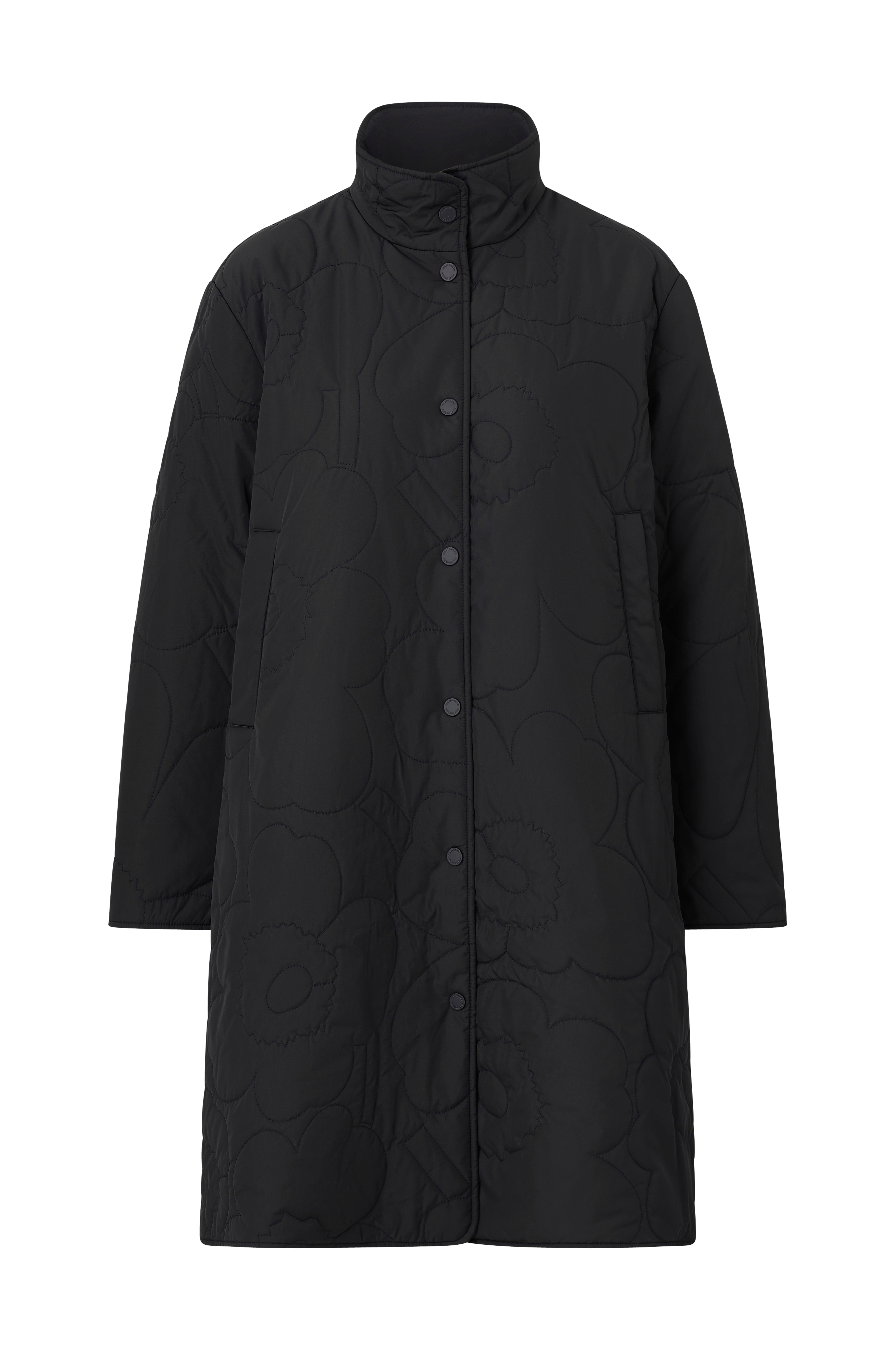 Den quiltede Keramika letvægtsfrakke med vattering har en afslappet, lige pasform og er syet i Piirto Unikko mønster. Den lange frakke har en høj stående krave, trykknaplukning, skrå paspolerede lommer med trykknaplukning foran og en indvendig brystlomme med skjult lynlåslukning.