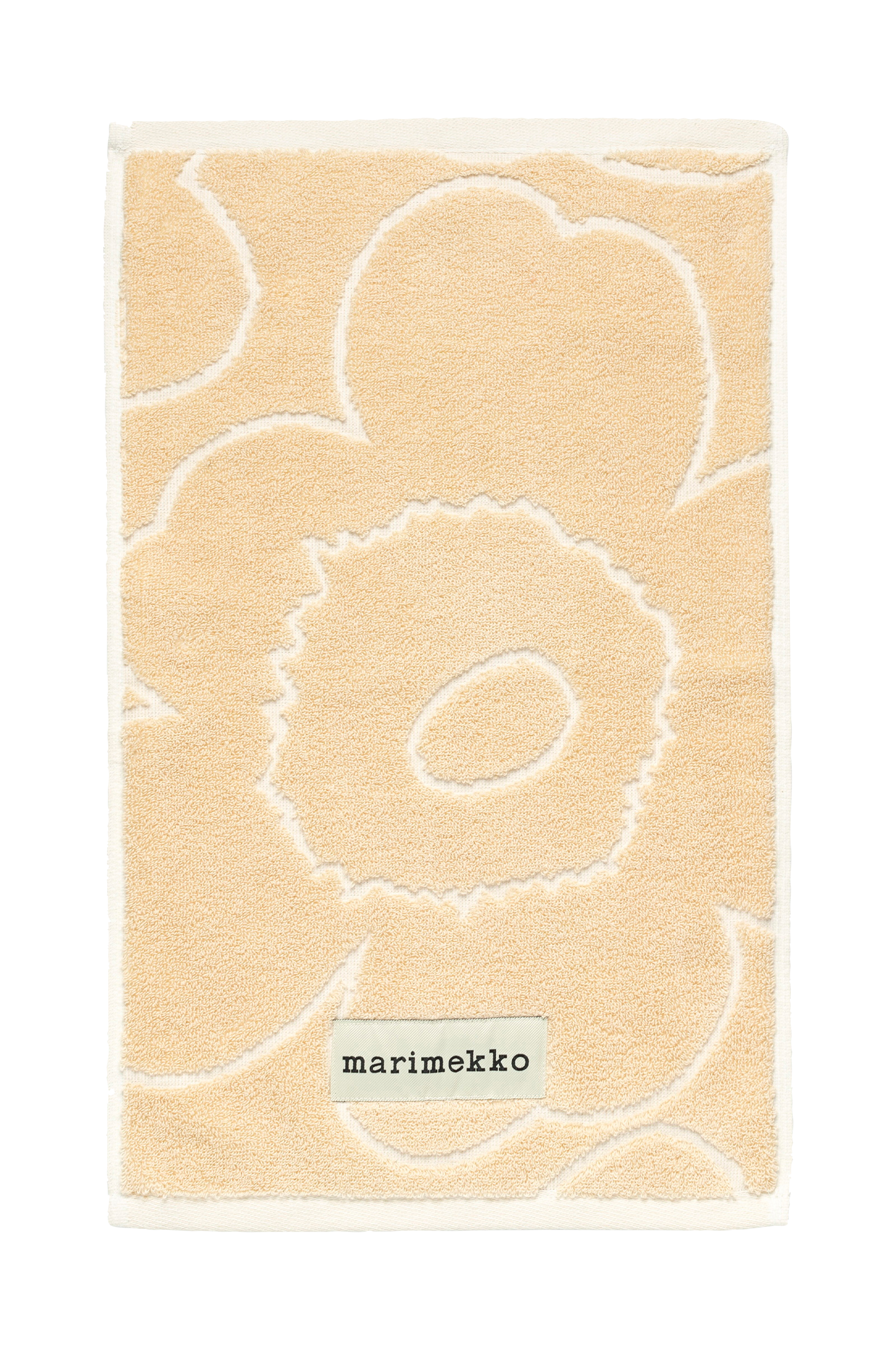 Dette gæstehåndklæde er lavet af kraftig økologisk bomuldsfrotté. Håndklædet har det prægede Piirto Unikko -mønster på den ene side og Marimekko-mærket på den nederste kant. Piirto Unikko er en stiliseret, luftig variation af den elskede blomst, som Maija Isola skabte i 1964. Den nikker til minimalisme, mens den understreger de grafiske linjer i Unikko -mønsteret.