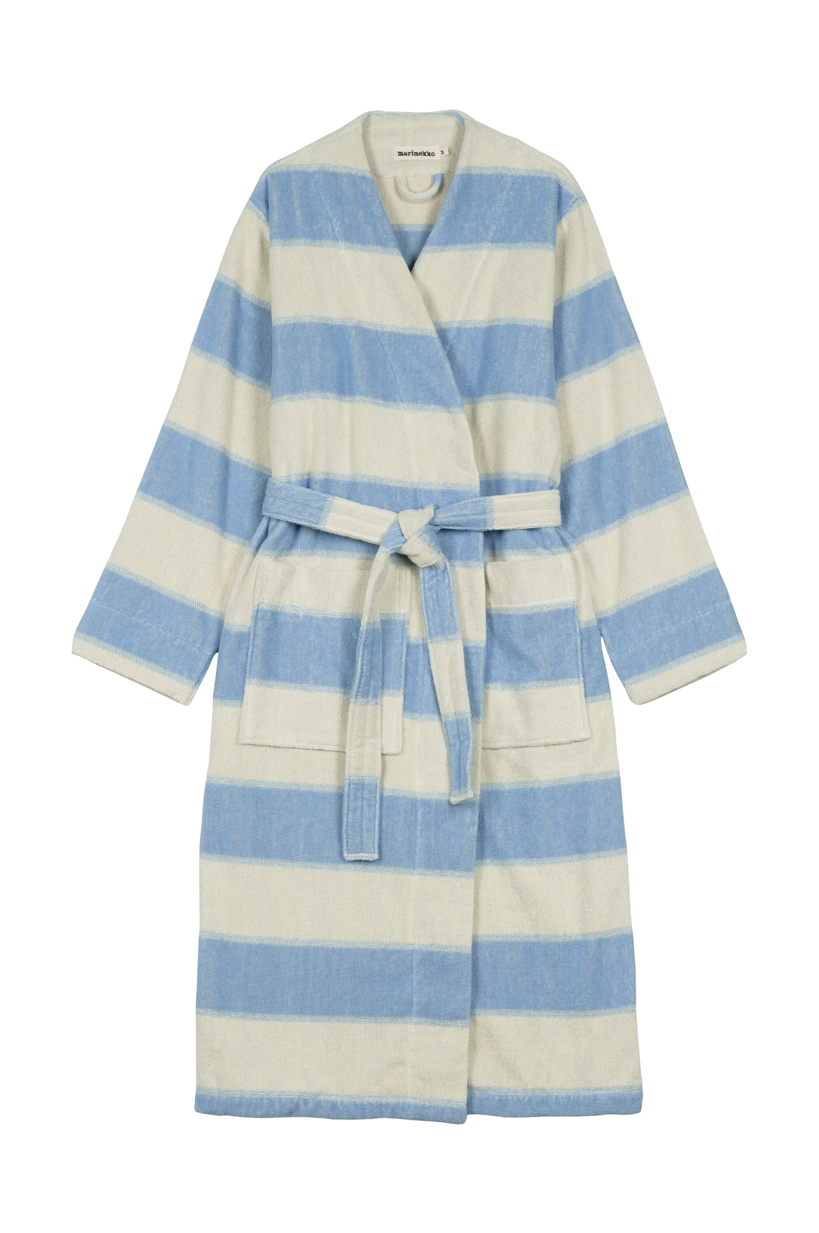 Den mønstrede Galleria badekåbe har lange ærmer med brede opsmøg ved håndleddene, påsatte lommer foran, et separat bælte og bæltestropper. Dette produkt er fremstillet af kraftig 100% bomuldsfrotté. Marimekkos printhistorie har altid været ret stribet. Nogle striber har stået alene, mens andre stille og roligt har understøttet andre mønstre. Nogle har levet i en sæson eller to, mens andre har holdt ud i årtier. Galleria Den nye kollektion, designet af Vuokko Eskolin-Nurmesniemi, er et af de stærke print, der er blevet tidløse klassikere. Anbefales: Følg den angivne vasketemperatur, Vask med lignende farver, Vask før brug, Krympning max. 6%, Tilsæt ikke skyllemiddel.