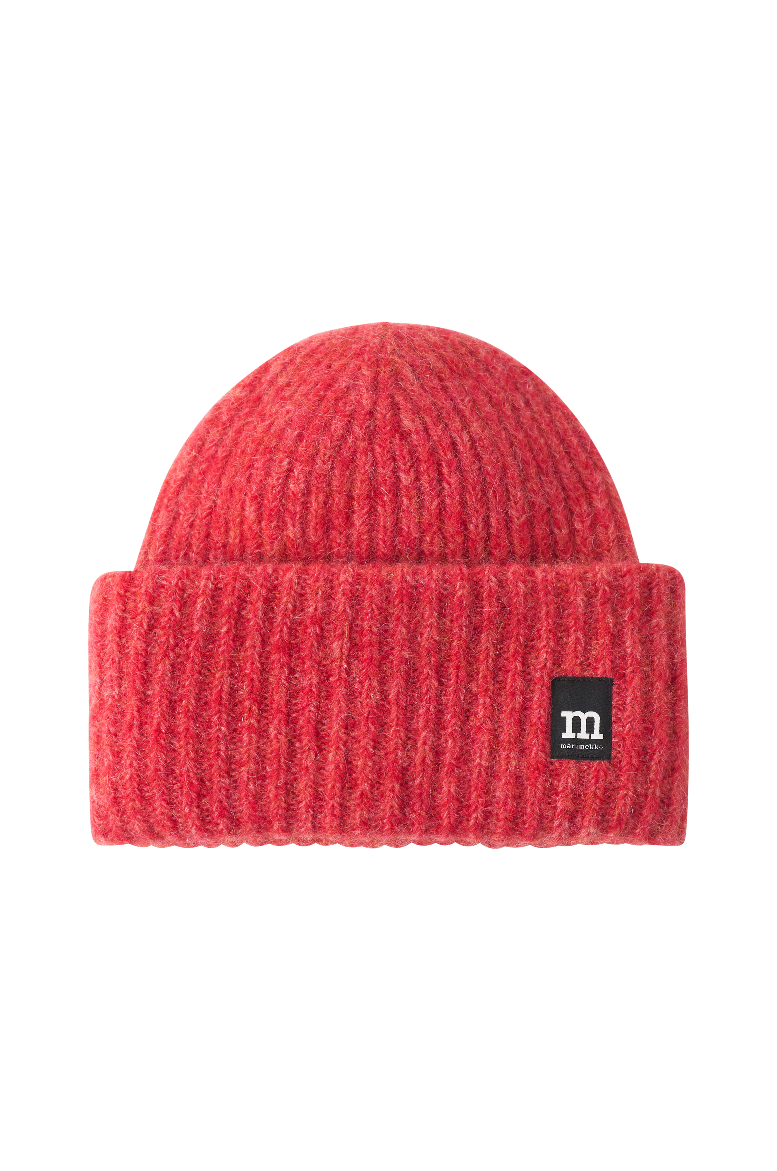 Den tykke, strikkede hue fra Reivi har en kant, der er foldet om to gange. Marimekko-mærket er syet på forsiden.