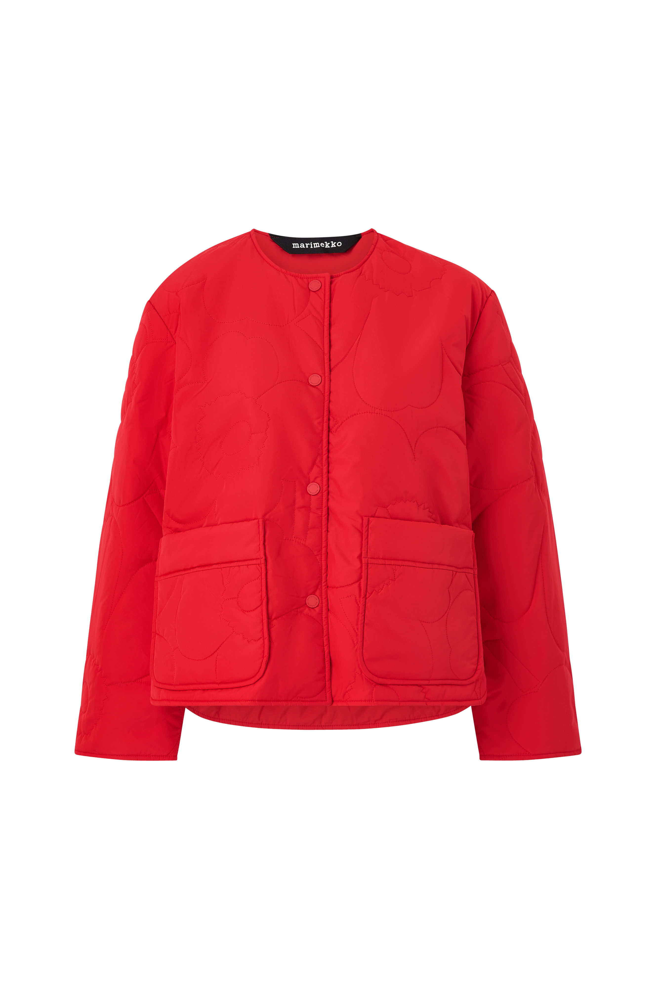 Den vatterede Kapseli letvægtsjakke har en afslappet, lige pasform og er syet i Piirto Unikko mønster. Jakken har O-hals, trykknaplukning, påsatte lommer foran og en indvendig brystlomme med skjult lynlåslukning. Den runde forneden er længere bagpå end foran, og der er slidser i sidesømmene.
