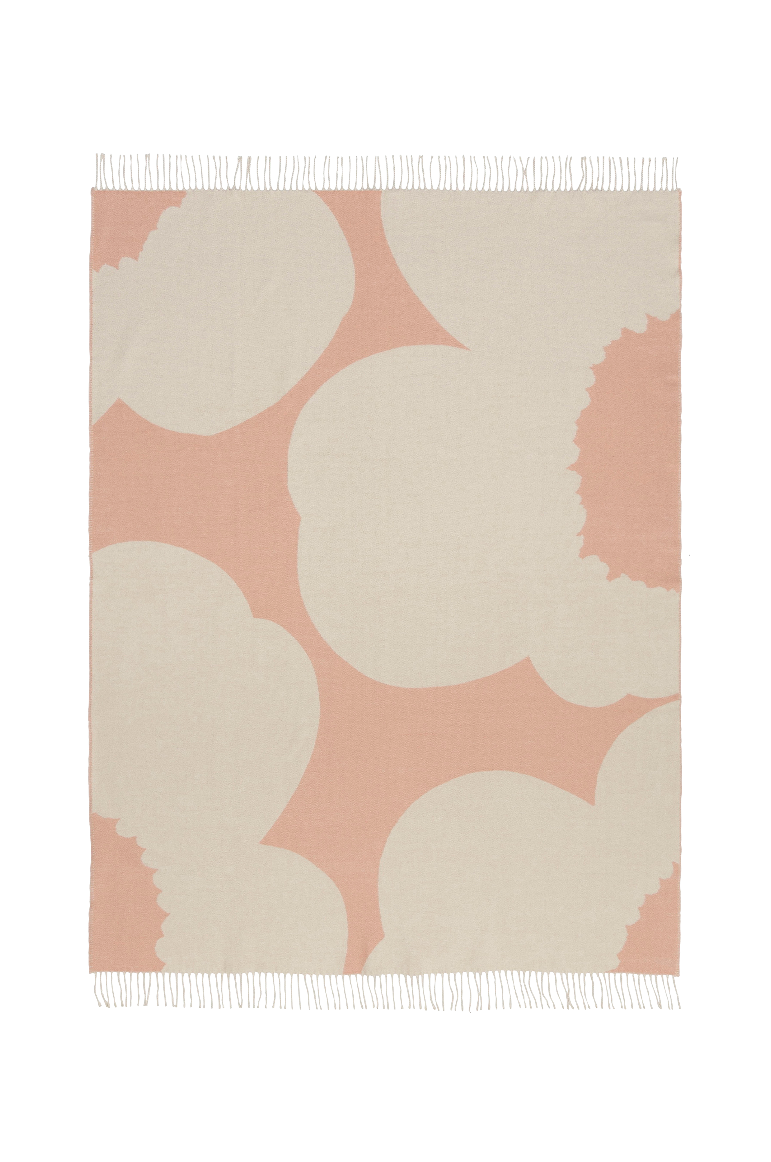 Det mønstrede Unikko tæppe er lavet af en uld- og bomuldsblanding med jacquardstrik. Tæppet har frynser i enderne. Mønsterets farver er vendt om på den anden side af tæppet. Produkter vævet med jacquardteknik kan variere en smule i størrelse. Unikko blev skabt af Maija Isola i 1964 og er siden blevet et internationalt ikon for printdesign. Grundlæggeren af Marimekko, Armi Ratia, mente, at det ikke var muligt at indfange den sande essens af ægte blomster på tryk, og derfor var blomsterprint tidligere udelukket fra Marimekkos kollektioner. Så Maija Isola designede Unikko til at være en abstraktion af en blomst snarere end en fotorealistisk gengivelse. I dag er Unikko et stærkt symbol på glæde og kreativitet, som er integreret i Marimekkos designidentitet.