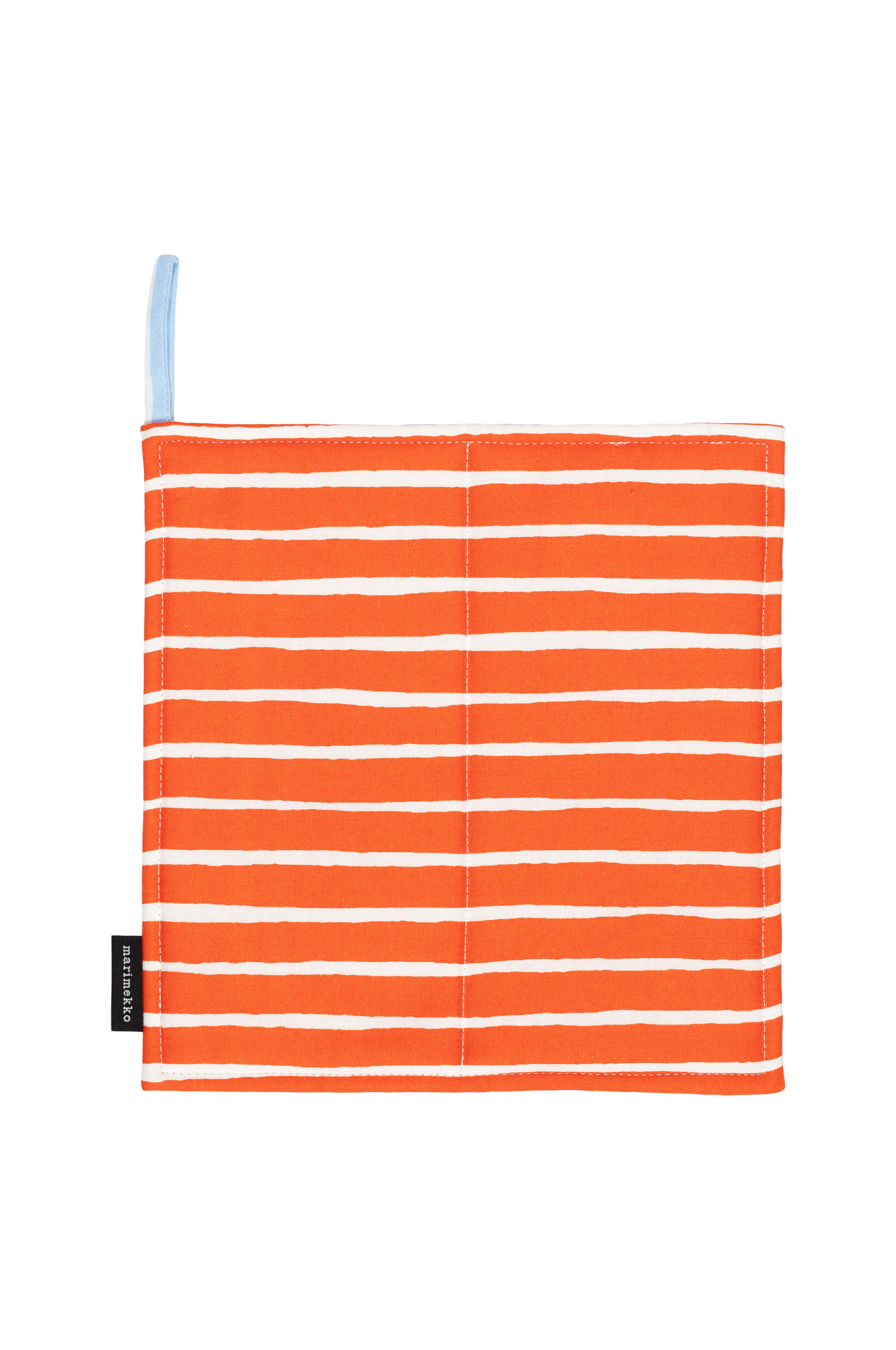 Den mønstrede Piccolo grydelap er lavet af økologisk bomuld, og den er trykt i Helsinki. Grydelappen har Piccolo -mønsteret i to forskellige farver, og den har et polstret fyld og en ophængningsstrop. 50 % af den polyester, der er brugt i fyldet, er genanvendt. I 1953, samme år som hun kom til Marimekko, skabte Vuokko Eskolin-Nurmesniemi Piccolo, et stribet stofmønster malet med levende penselstrøg. Tre år senere dukkede Jokapoika-skjorten (alle drenge) lavet af stoffet op i butikkerne og på gaderne - for altid, ser det ud til. 21,5 x 21,5 cm