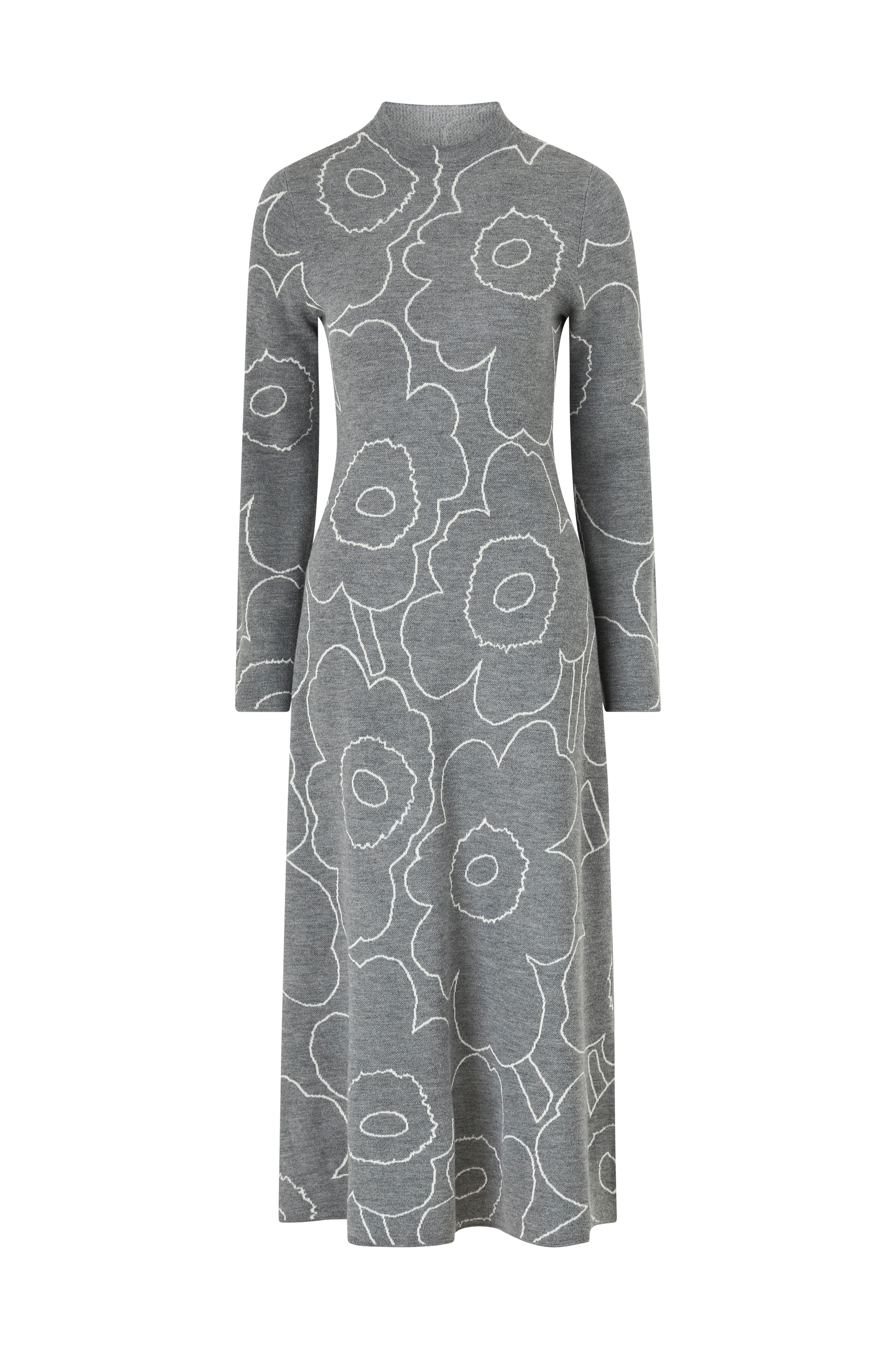 Den strikkede kjole fra Willat har en slank pasform, en lige overdel og et udslået snit forneden. Kjolen har et jacquardstrikket Piirto Unikko mønster, en hævet halsudskæring og lange ærmer med et let trompetsnit.