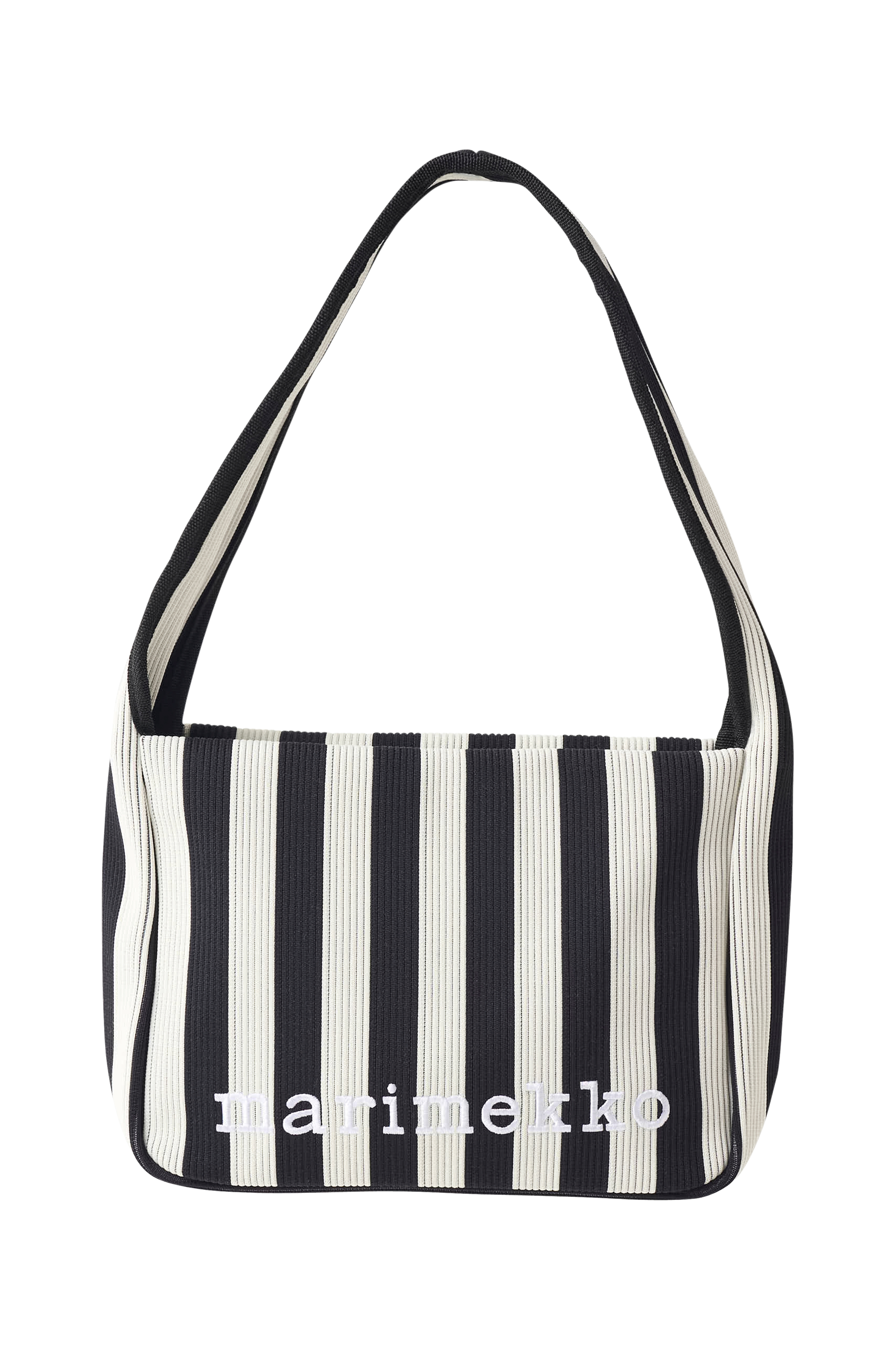 Knitted Shoulderbag har det jacquardstrikkede Merirosvo -mønster, og den er lavet af fast genbrugspolyester med et ribbet look. Tasken har en bred skulderrem, lynlåslukning og det broderede Marimekko-logo på forsiden.