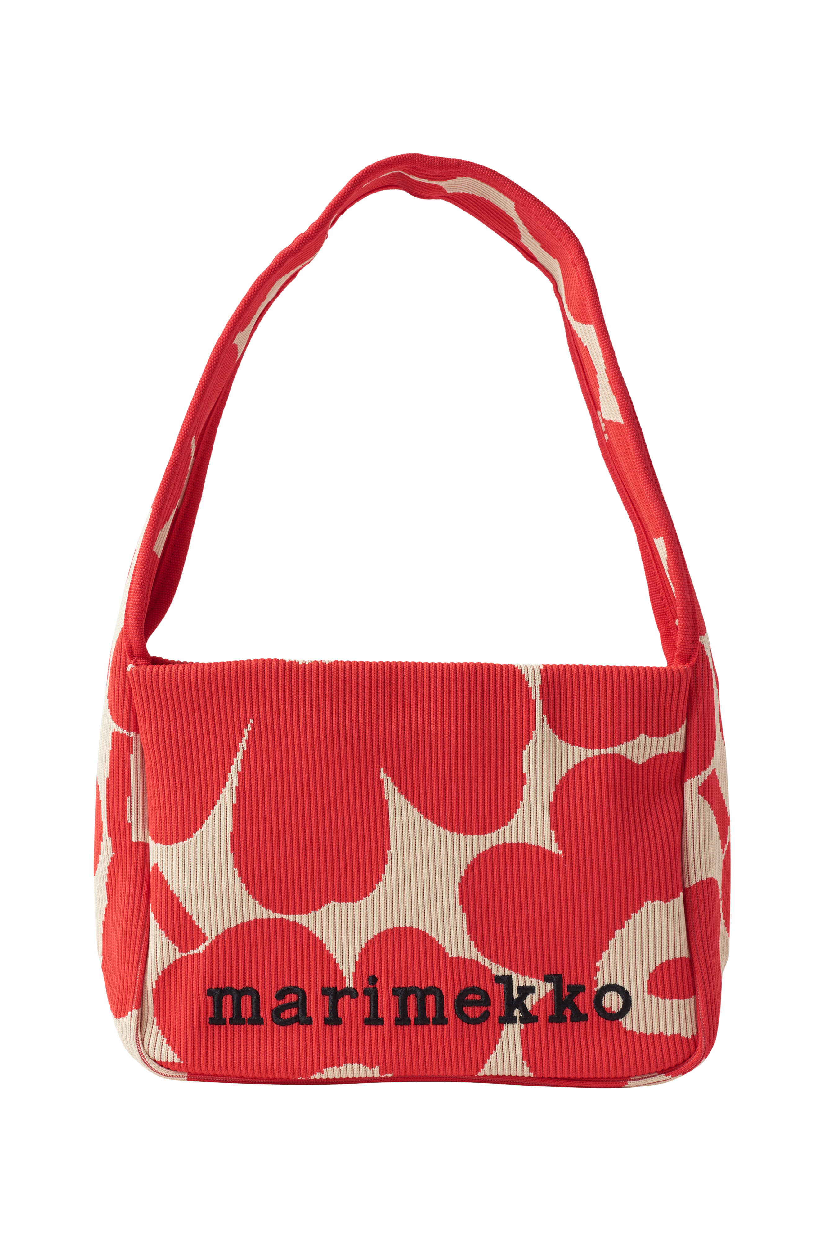 Knitted Shoulderbag har det jacquardstrikkede Unikko -mønster med et ribbet look. Tasken har en bred skulderrem, lynlåslukning og det broderede Marimekko-logo på forsiden.