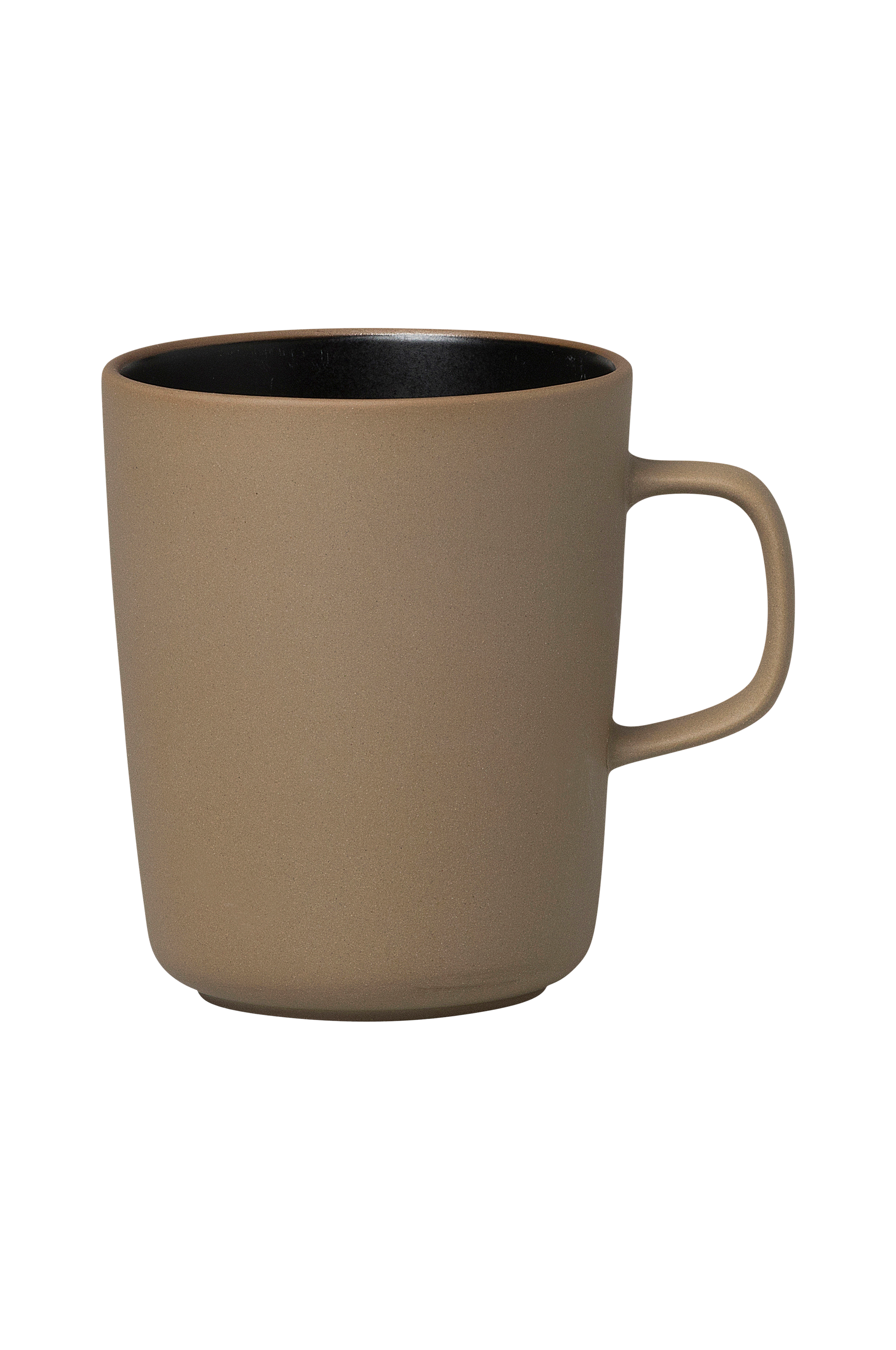 Oiva-krus af brunt stentøj som tåler opvaskemaskine, ovn, mikrobølgeovn og fryser. Udvendigt har kruset en grov overflade uden glasering, og indvendigt har det en sort, mat glasering. Variationer i nuance og farve forekommer naturligt i brunt stentøj, hvilket har sin egen charme og gør hvert produkt unikt.