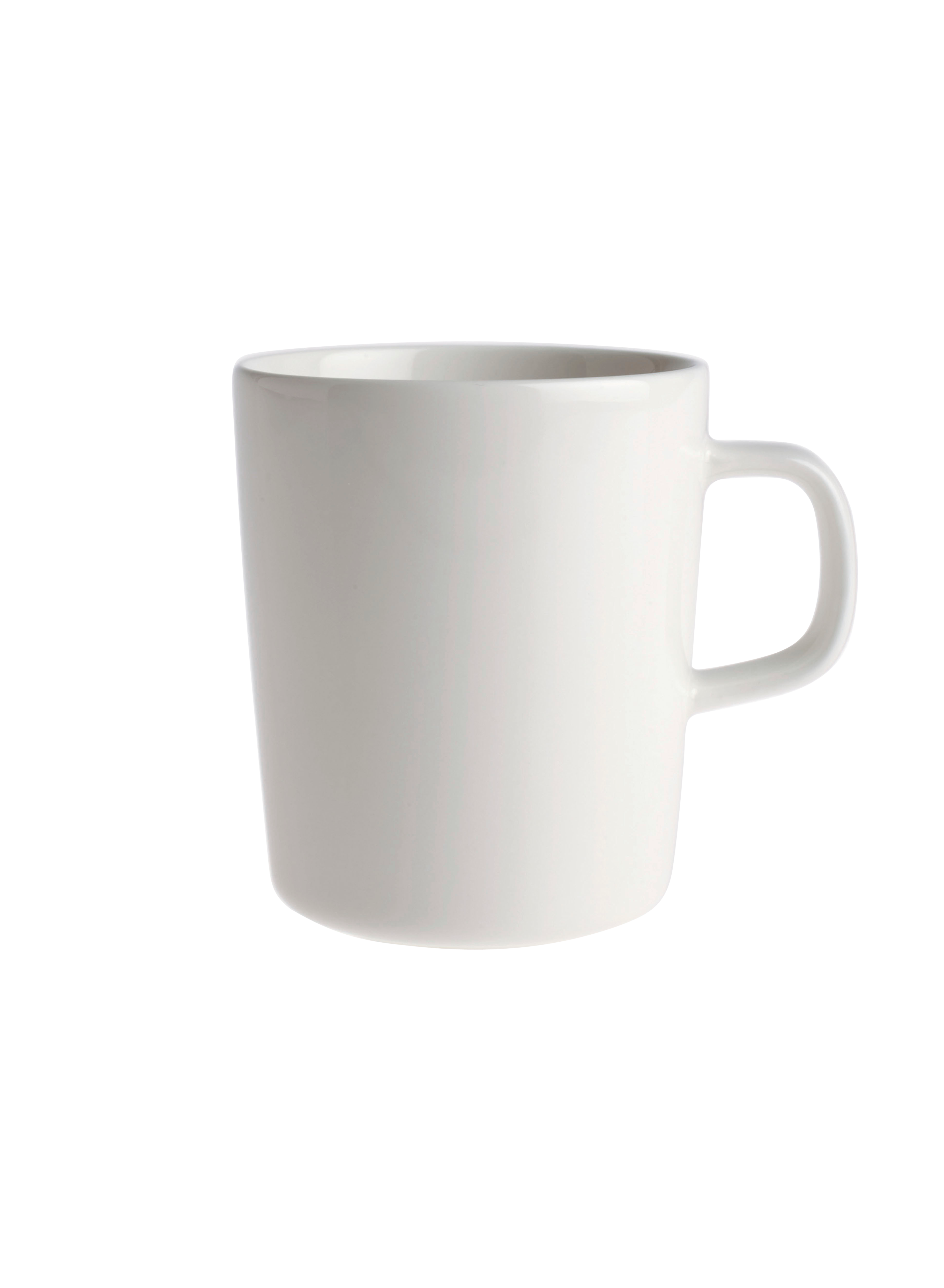 Hvide Oiva-krus giver balance til et opdækket bord som er rigt på farver og mønstre. Materiale: stentøj. Tåler maskinopvask, mikrobølgeovn og fryseskab. 2,5 dl.