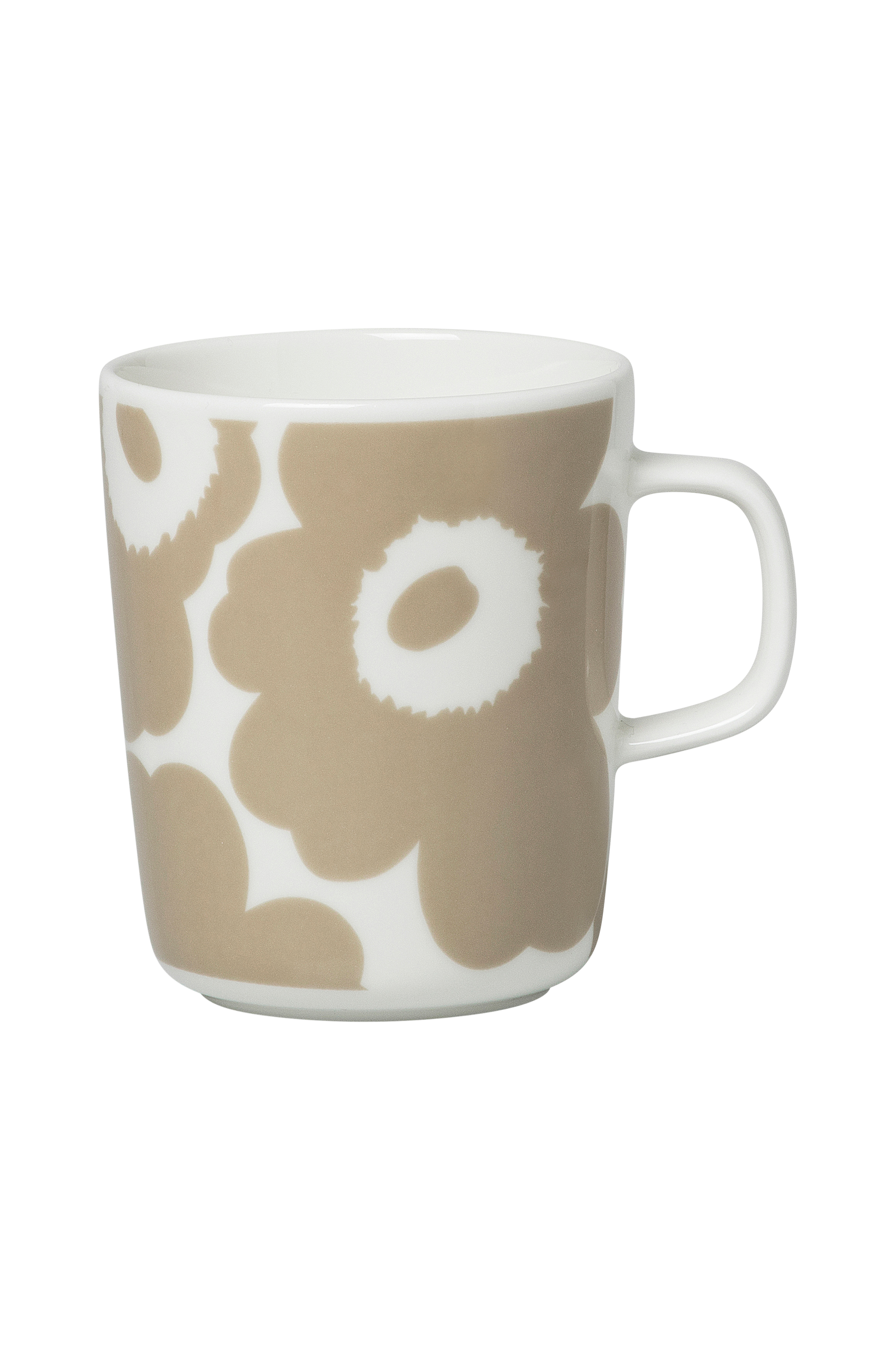 Krus Oiva med Unikko-mønster (valmue) i hvid og beige. Hvidt stentøj som tåler opvaskemaskine, ovn, mikrobølgeovn og fryser. Marimekkos berømte valmuemønster Unikko blev designet i 1964 i en periode, hvor abstrakte mønstre gennemsyrede kollektionerne. Designer Maija Isola ville skabe noget interessant i dette organiske tema og designede mange forskellige blomstermønstre. I dag symboliserer det ikoniske blomstermotiv kreativitet.