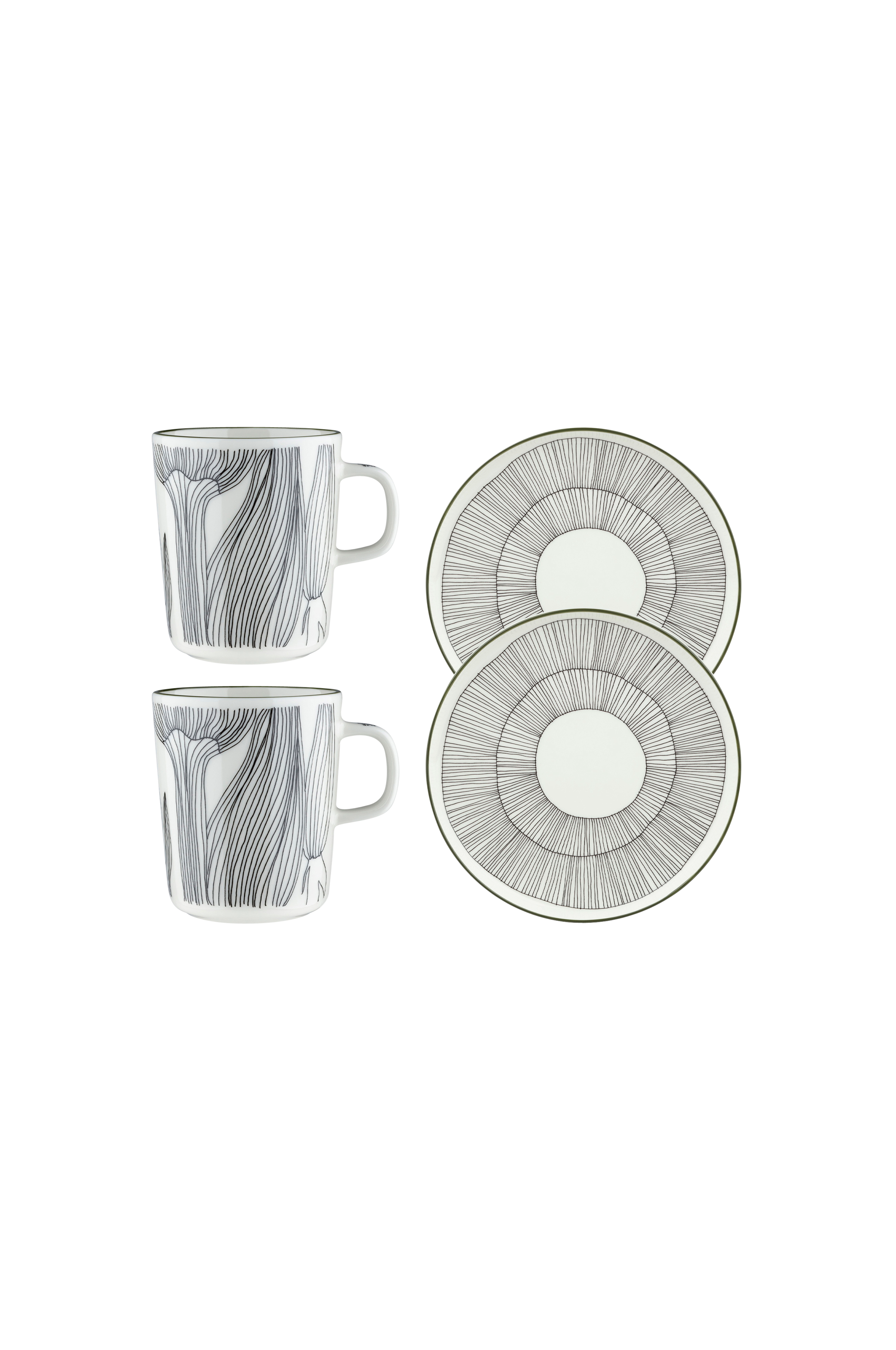 Kukat Puhkeavat mønster Oiva morgenmadssæt indeholder to 2,5 dl kaffekopper og to 20 cm tallerkener. Kopperne og tallerkenerne har håndmalede grønne kanter, og de tåler opvaskemaskine, ovn, mikroovn og fryser. Produkterne er lavet af hvidt stentøj. Sættet er pakket i en æske med Marimekko-logomønster. Oiva-produkterne er designet af Sami Ruotsalainen. Fjern venligst klistermærket fra bunden af produktet før brug. Klistermærket indeholder en lille mængde metal. Maija Louekaris Kukat puhkeavat (flowers bloom) mønster udforsker blomster fra et græsrodsniveau og skildrer det særlige øjeblik, hvor knopper springer ud i blomst. Mønsterets stregtegnede overflade skaber også en stribet effekt, som, når den ses i stor skala, giver ro. I et øjeblik er alting smukt - men så flygtigt. Verden er fuld af mirakler!