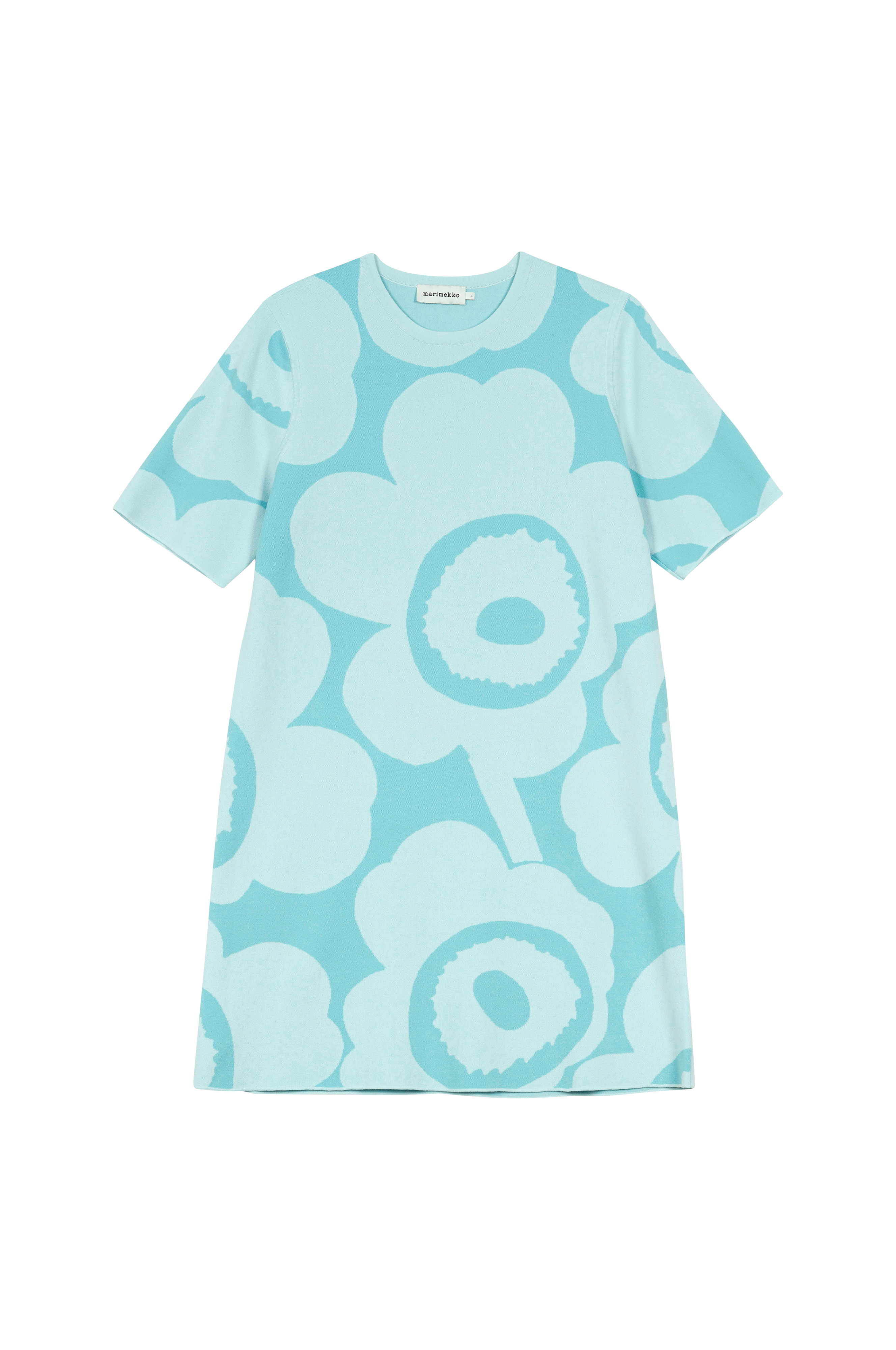 Den strikkede kjole fra Mahdollisuus har en afslappet, lige pasform. Kjolen har et jacquardstrikket Unikko mønster, en O-hals og korte ærmer med en ribbet afslutning øverst på ærmegabene.