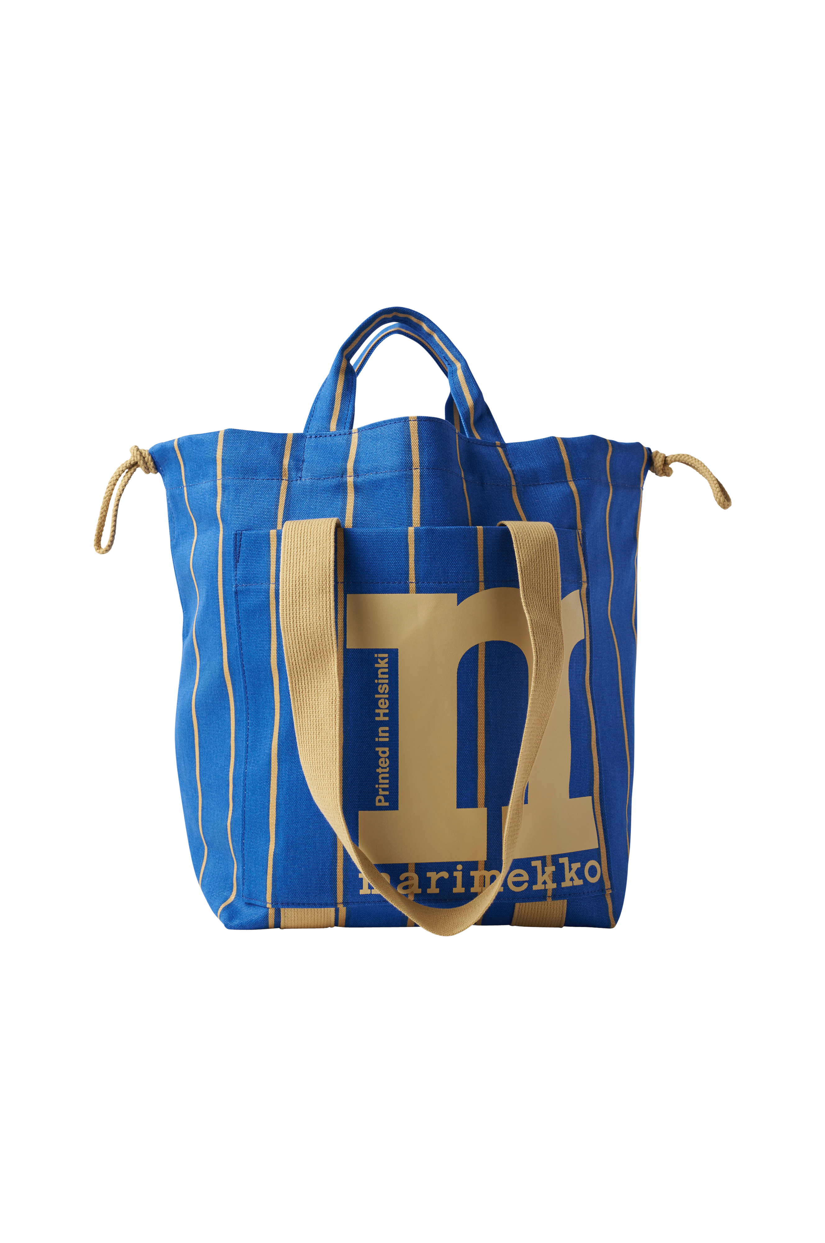 Mono City Tote er lavet af økologisk bomuld, og den har Puhveli-mønsteret, som er trykt i Helsinki. Det store Marimekko "M" er trykt på forsiden. Tasken har både korte og lange hanke og en åben lomme på ydersiden. Der er snore i siderne, som kan bruges til at stramme åbningen og ændre taskens silhuet. Striber har altid været en fast bestanddel i Marimekkos mønsterverden. Puhveli (bøffel) er en luftig lodret stribe designet af Maija Isola i 1964.