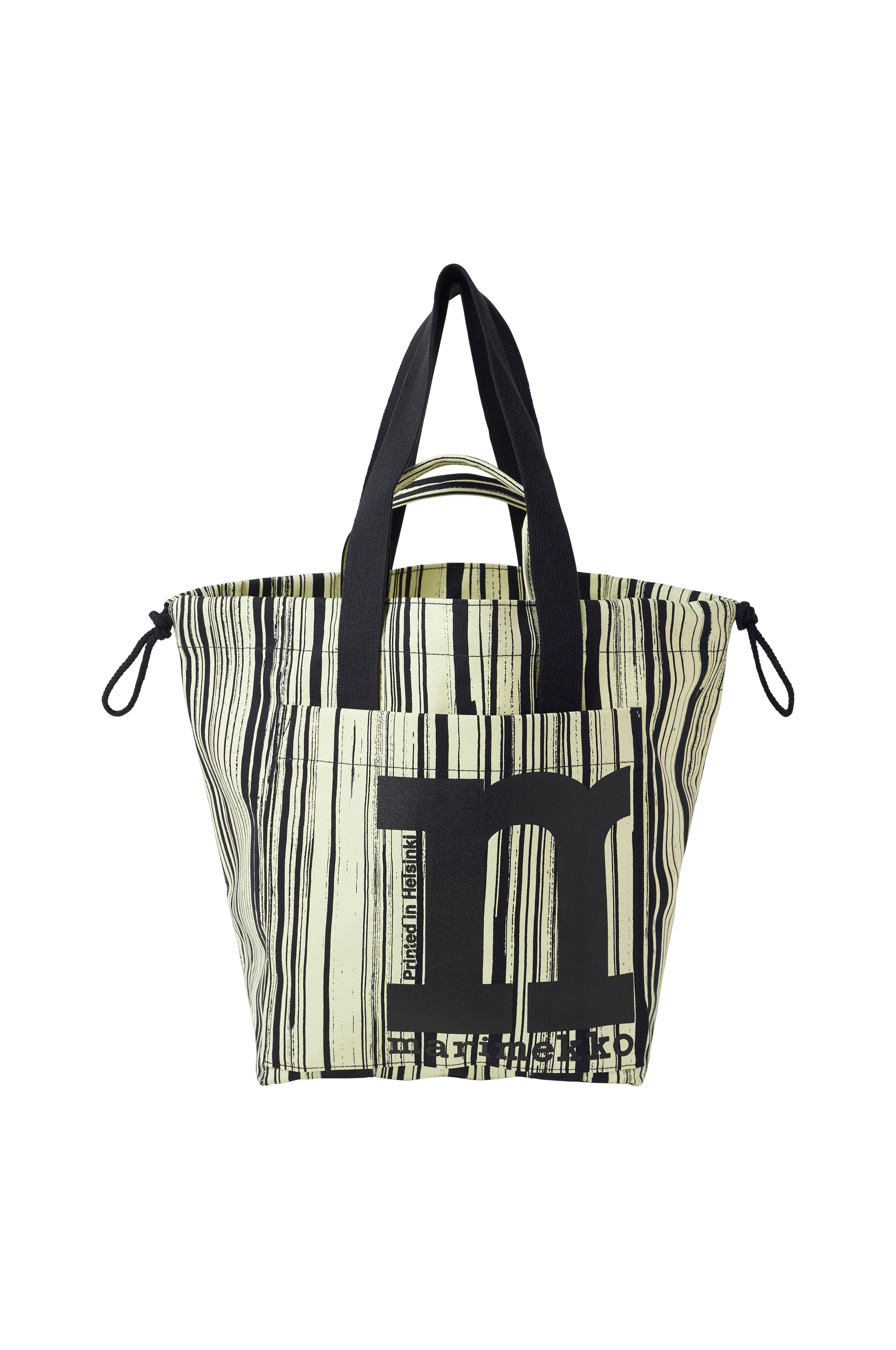 Mono City Tote er lavet af økologisk bomuld, og den har Siluetti -mønsteret, som er trykt i Helsinki. Det store Marimekko "M" er trykt på forsiden. Tasken har både korte og lange hanke og en åben lomme på ydersiden. Der er snore i siderne, som kan bruges til at stramme åbningen og ændre taskens silhuet. Mønstret Siluetti (silhuet) viser, hvordan himlens og havets farver smelter sammen i horisonten. Carina Seth Andersson har malet de tynde, uregelmæssige striber i forskellige nuancer med lange strøg med en stiv pensel.