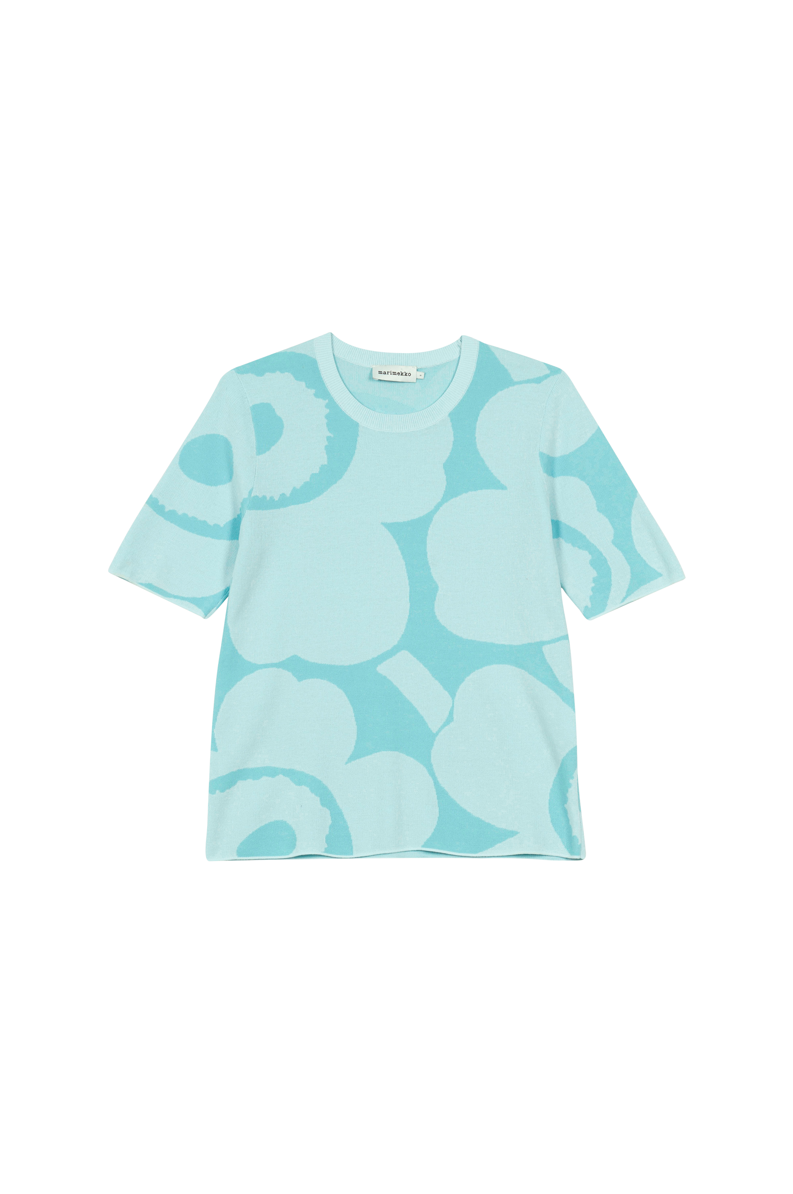 Den strikkede top Oletus har en slank, lige pasform. Toppen har det jacquardstrikkede Unikko mønster, en O-hals med en smal ribkant og korte, smalle ærmer.