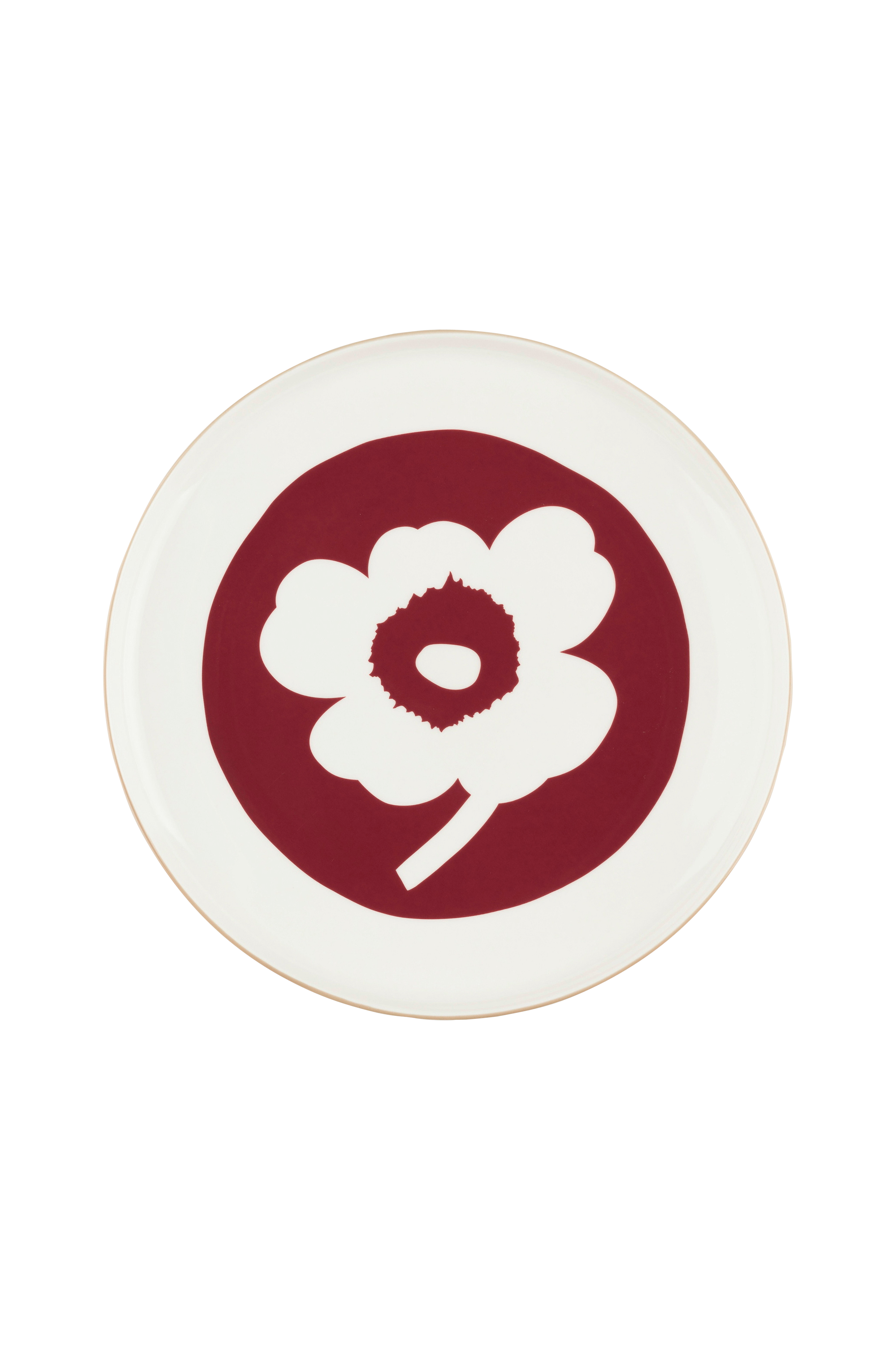 Oiva-tallerkenen er lavet af hvidt stentøj, og den tåler opvaskemaskine, ovn, mikroovn og fryser. Tallerkenen har blomsten Unikko i midten og en brun, håndmalet kant. Fjern venligst klistermærket fra bunden af produktet før brug. Klistermærket indeholder en lille smule metal. Unikko blev skabt af Maija Isola i 1964 og er siden blevet et internationalt ikon for printdesign. Grundlæggeren af Marimekko, Armi Ratia, mente, at det ikke var muligt at indfange den sande essens af ægte blomster på tryk, og derfor var blomsterprint tidligere udelukket fra Marimekko-kollektionerne. Så Maija Isola designede Unikko til at være en abstraktion af en blomst snarere end en fotorealistisk gengivelse. I dag er Unikko et stærkt symbol på glæde og kreativitet, som er integreret i Marimekkos designidentitet. 25 cm.