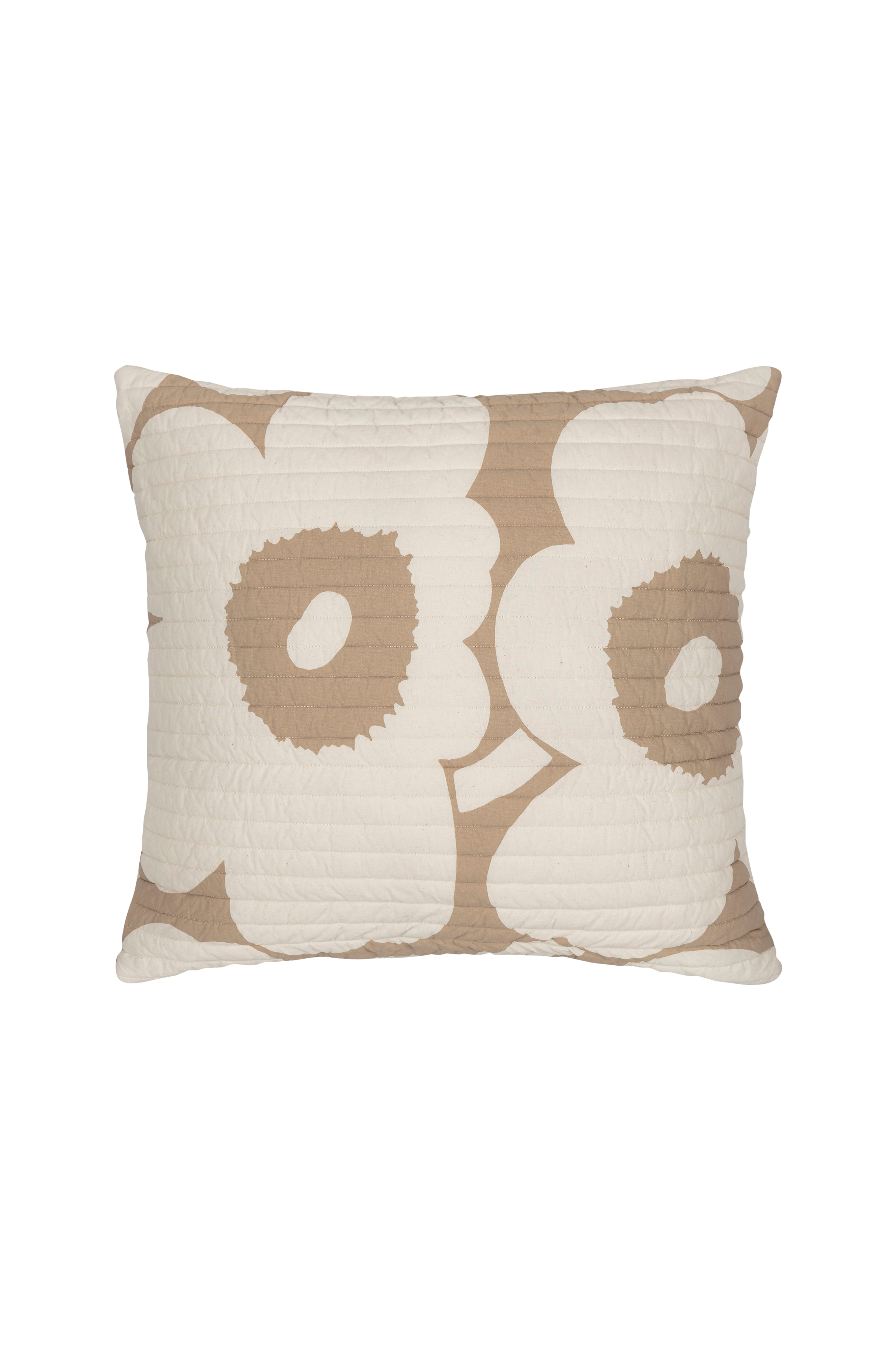Quiltet pude af ubleget bomuldsmateriale med Unikko-mønster. Pudebetrækket har en lynlås og monteringspuden kan tages ud. Vatteringen på indersiden er fremstillet af 100% genindvundet polyester. Marimekkos berømte valmuemønster Unikko blev designet i 1964 i en periode, hvor abstrakte mønstre prægede kollektionerne. Designer Maija Isola ville skabe noget interessant i dette organiske tema og designede mange forskellige blomstermønstre. I dag symboliserer det ikoniske blomstermotiv kreativitet.