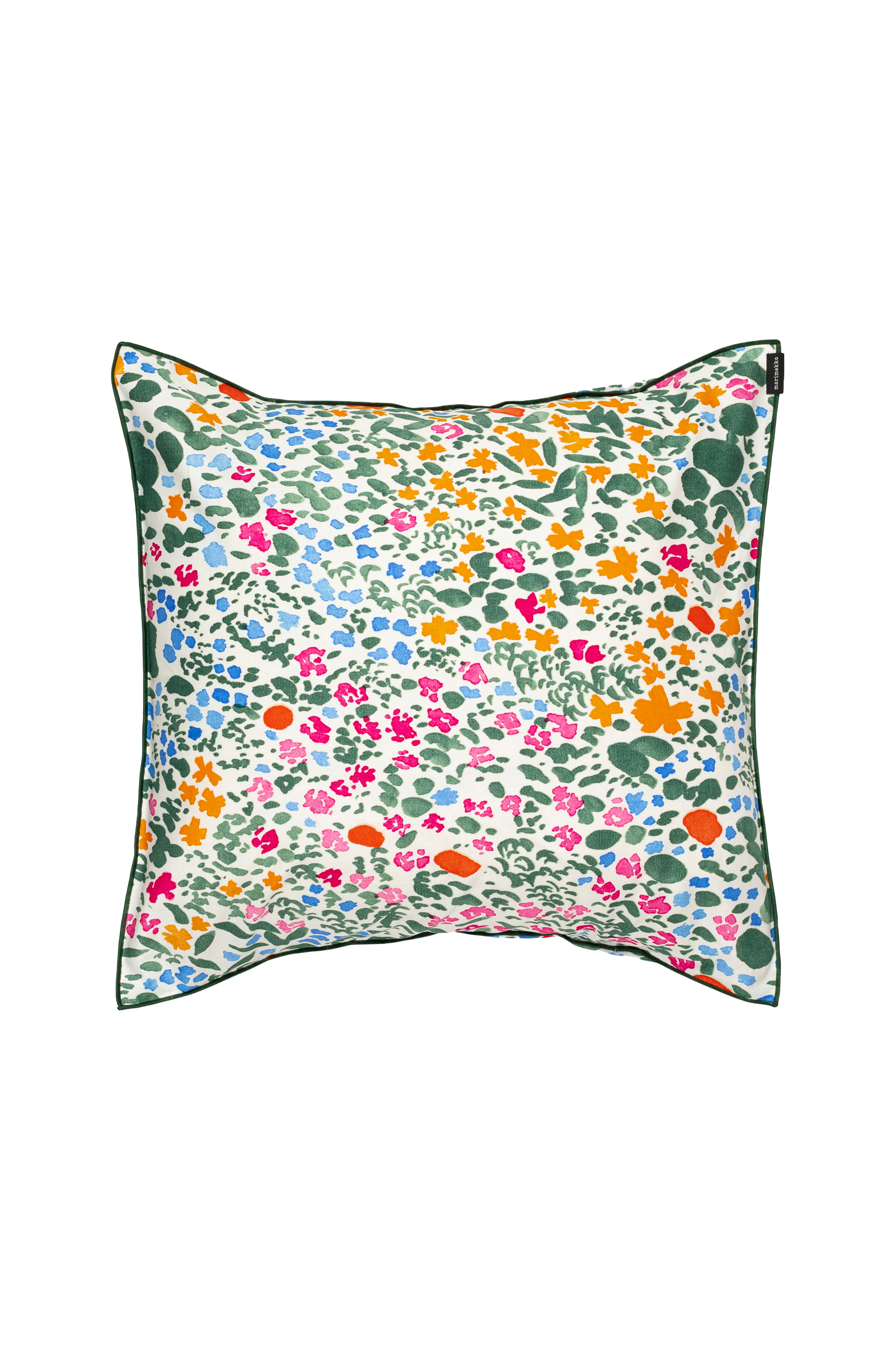 Det mønstrede Rantaniitty pudebetræk er lavet af bomuld og er trykt i Helsinki. Betrækket har en grøn picot-kant. 50 % af den bomuld, der er brugt i dette produkt, er økologisk, og 50 % er genanvendt. Ublegede stoffer såvel som stoffer, der indeholder genbrugsfibre, har en naturlig livlig farve og overflade, hvor der kan forekomme små forskelligfarvede områder. Der kan være forskelle mellem produkterne med hensyn til denne funktion.