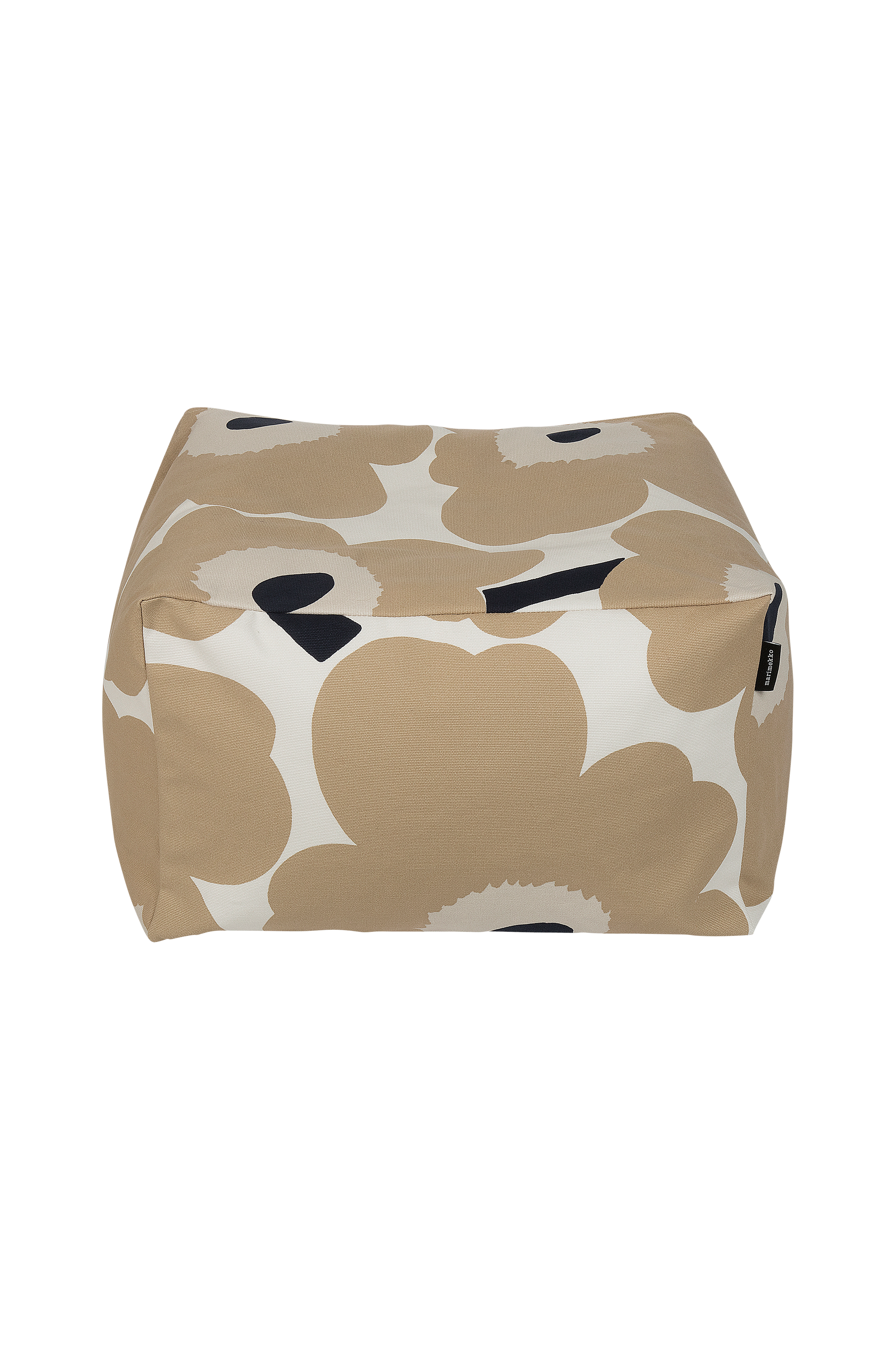 Blød siddepuf i kraftigt møbelstof af bomuld med Unikko-mønster (valmue) i offwhite, beige og mørkeblå. Puden er fyldt med små polystyrenkugler og betrækket kan tages af og vaskes. Størrelse 55 x 55 x 35 cm.
