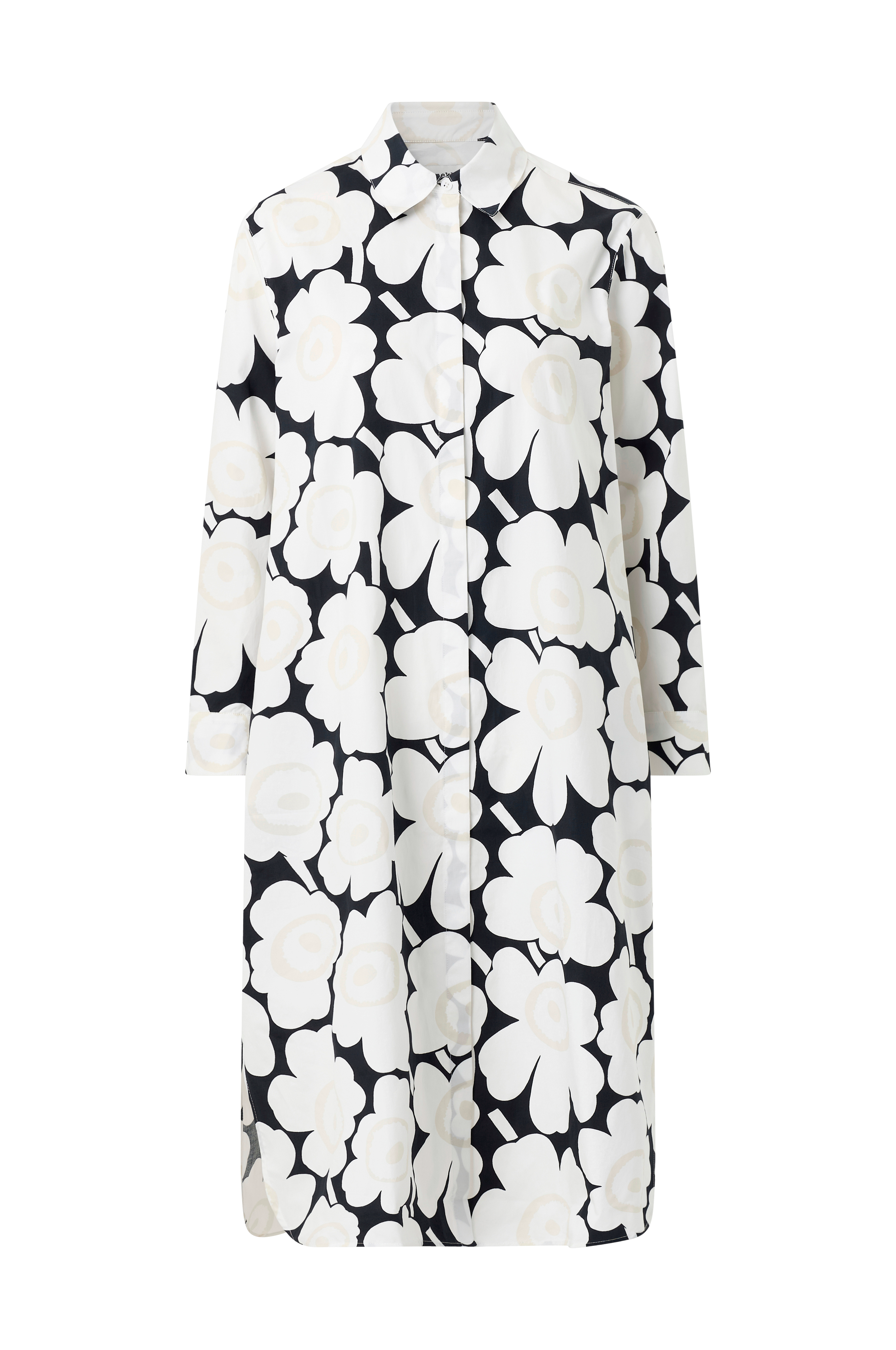 Skjortekjolen i bomuldspoplin fra Runoelma har en afslappet, A-formet pasform og er trykt i Unikko -mønsteret. Kjolen har en spids krave, skjult knaplukning, sidesømslommer og en buet kant forneden. De opsmøgede ærmer har knaplukning.
