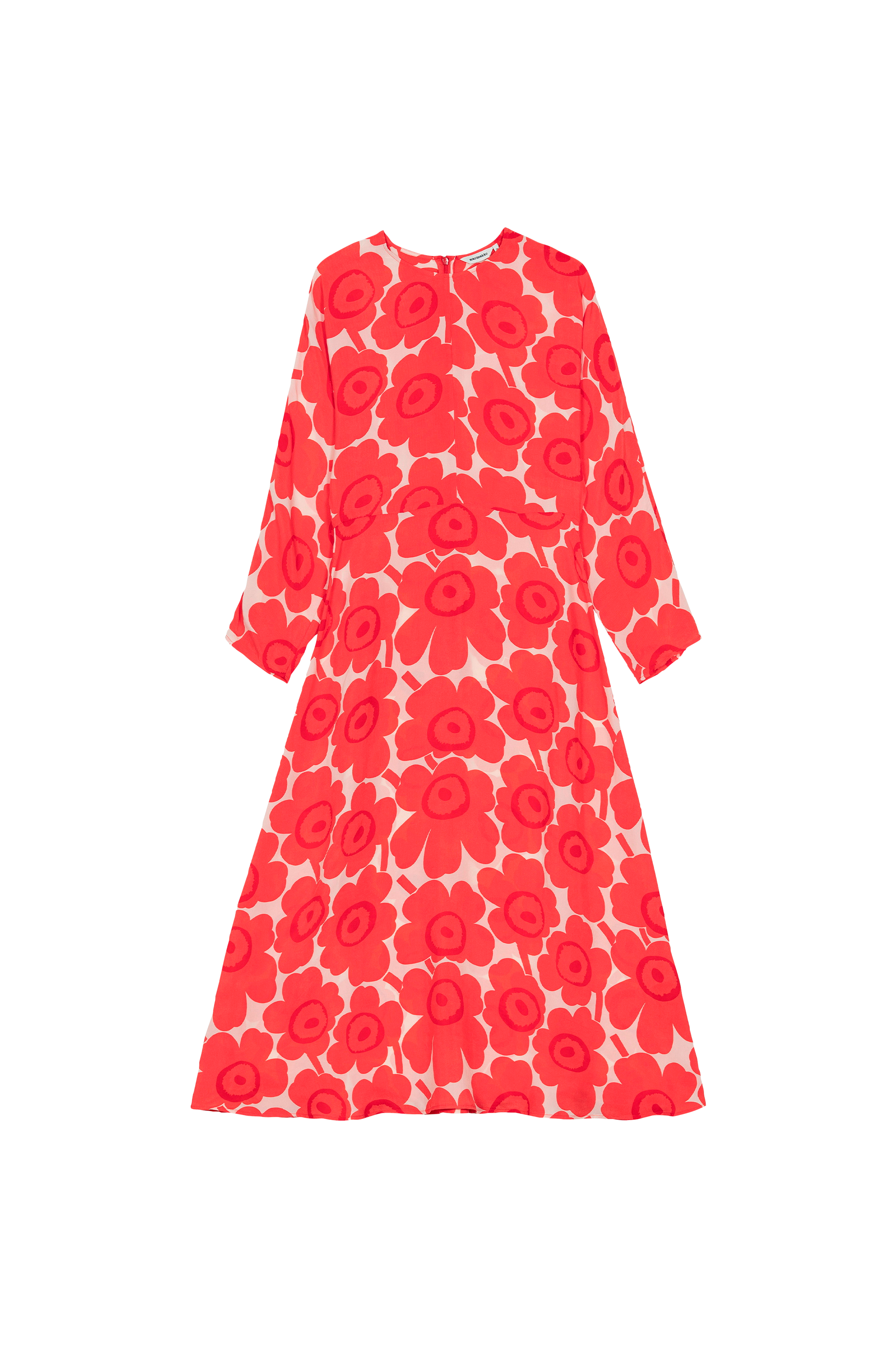 Rytmi kjolen har en slank pasform, en lige overdel og et udslået snit forneden. Kjolen har Unikko -mønsteret, og den har O-hals, skjult lynlås i den centrale rygsøm og lange kimonoærmer. Kjolen har en kort midtersøm foran, der ender i taljesømmen.