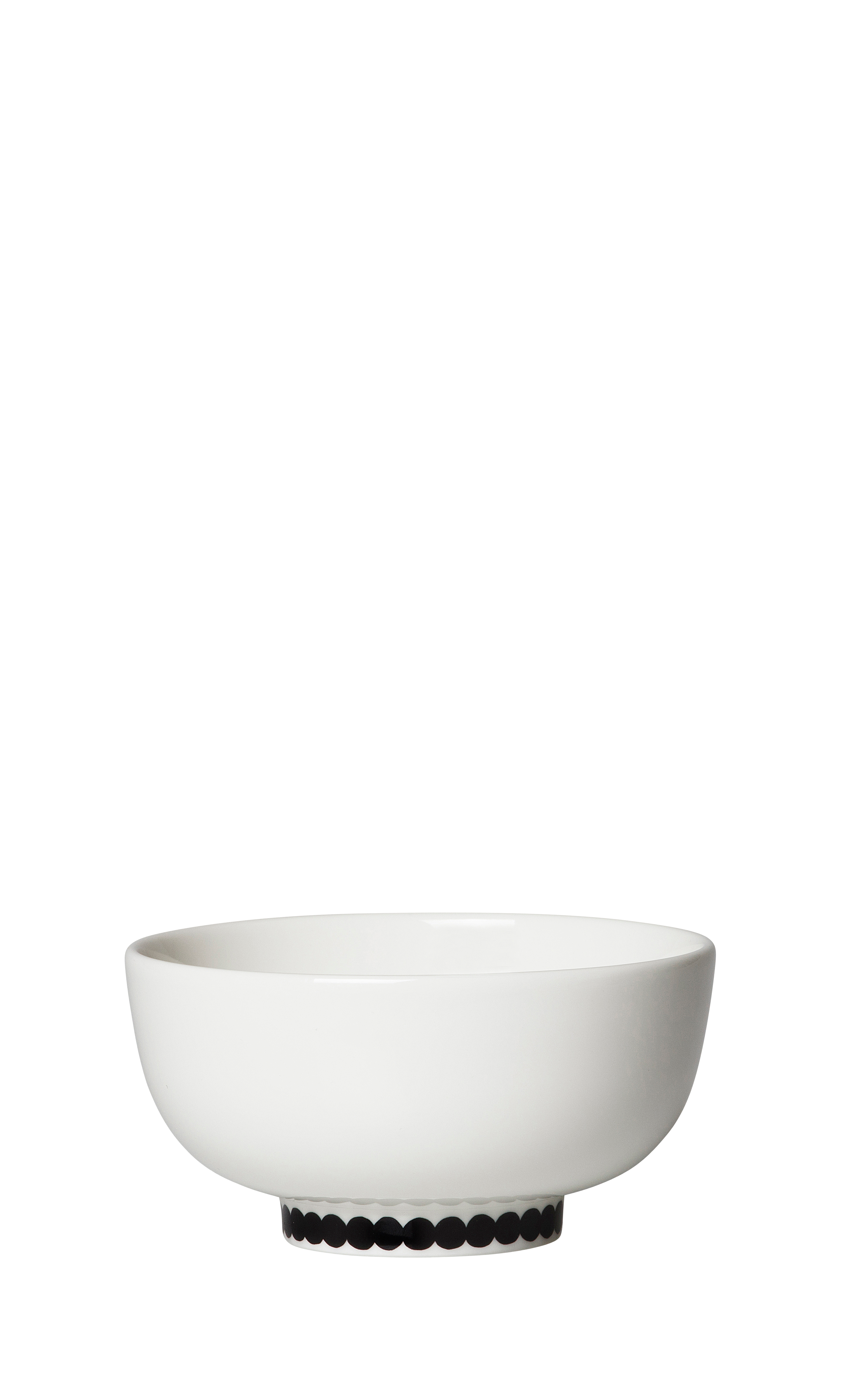 Lille skål i hvidt stentøj med Räsymatto-mønster. Tåler opvaskemaskine, ovn, mikrobølgeovn og fryser. Volumen 3 dl.