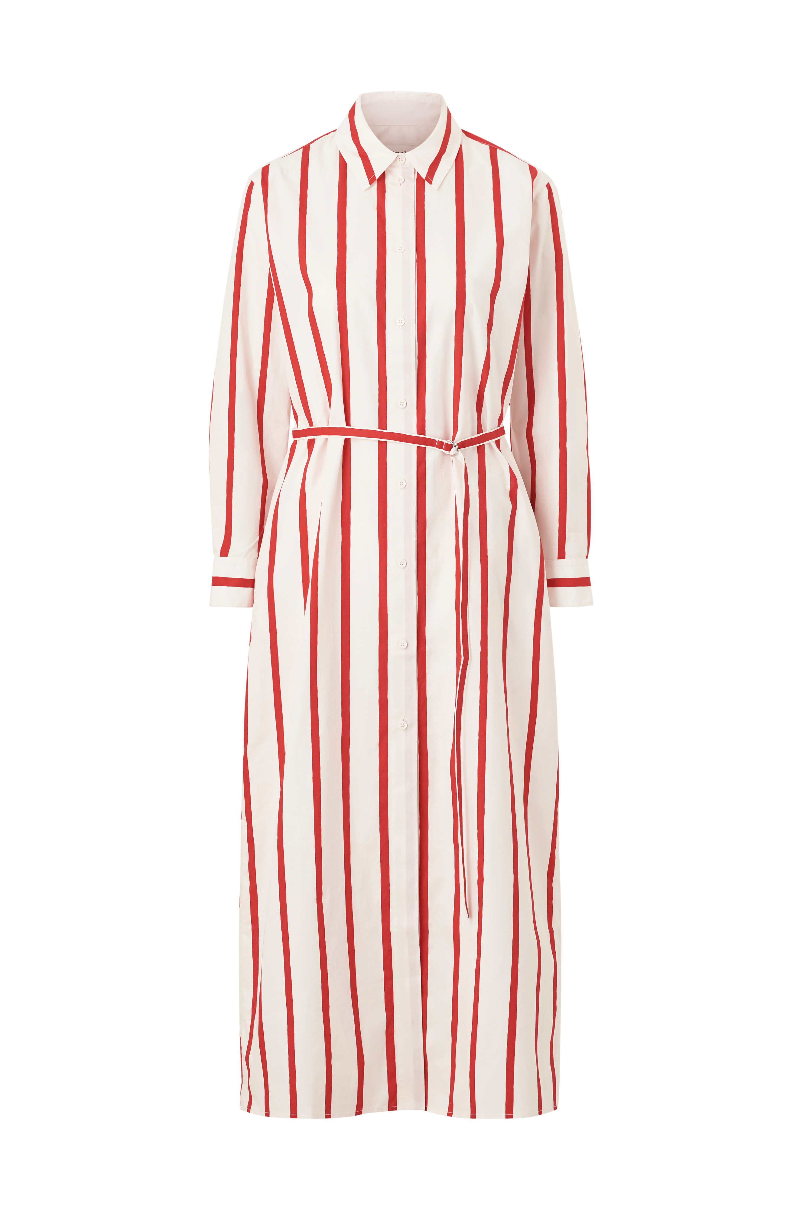 Skjortekjolen Muovata er lavet af bomuldspoplin, og den har en afslappet, lige pasform. Kjolen har Puhveli -mønsteret, og den har en spids krave, knaplukning og sidesømslommer. Kjolen har en bæresøm og læg i ryggen, og der medfølger et smalt, separat bælte med D-ring. De opsmøgede ærmer har knaplukning.