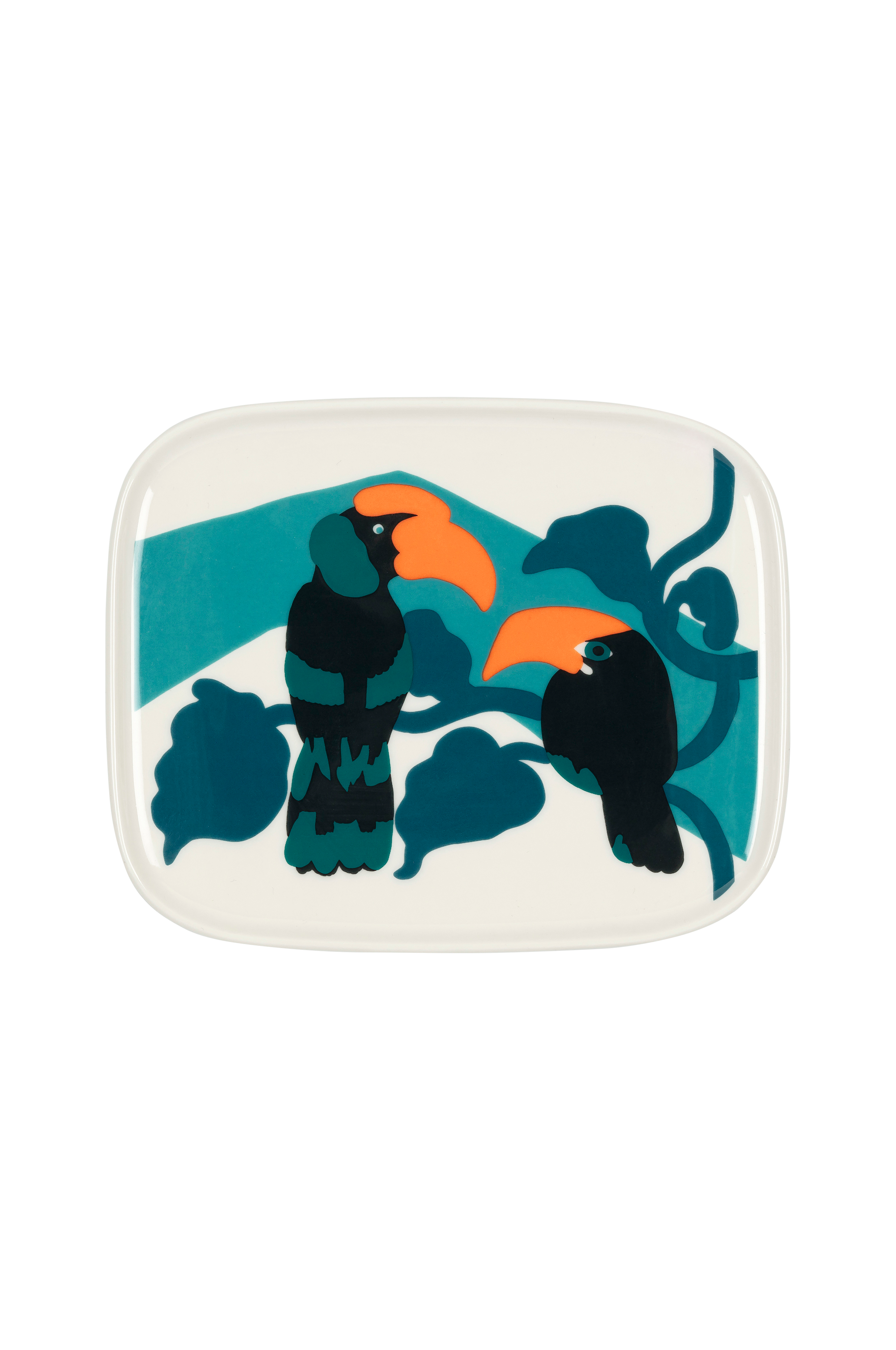 Oiva tallerken i hvidt stentøj med mønsteret Pepe. Den lille tallerken tåler opvaskemaskine, ovn, mikrobølgeovn og fryser. Det sjove mønster Pepe forestiller to fugle på en gren og er designet af Maija Isola 1970. Maija Isolas mønstre dækker et utroligt bredt spektrum af motiver og designteknikker. Hun hentede inspiration i såvel traditionel folkekunst som moderne billedkunst, i naturen og fra sine utallige rejser rundt om i verden.