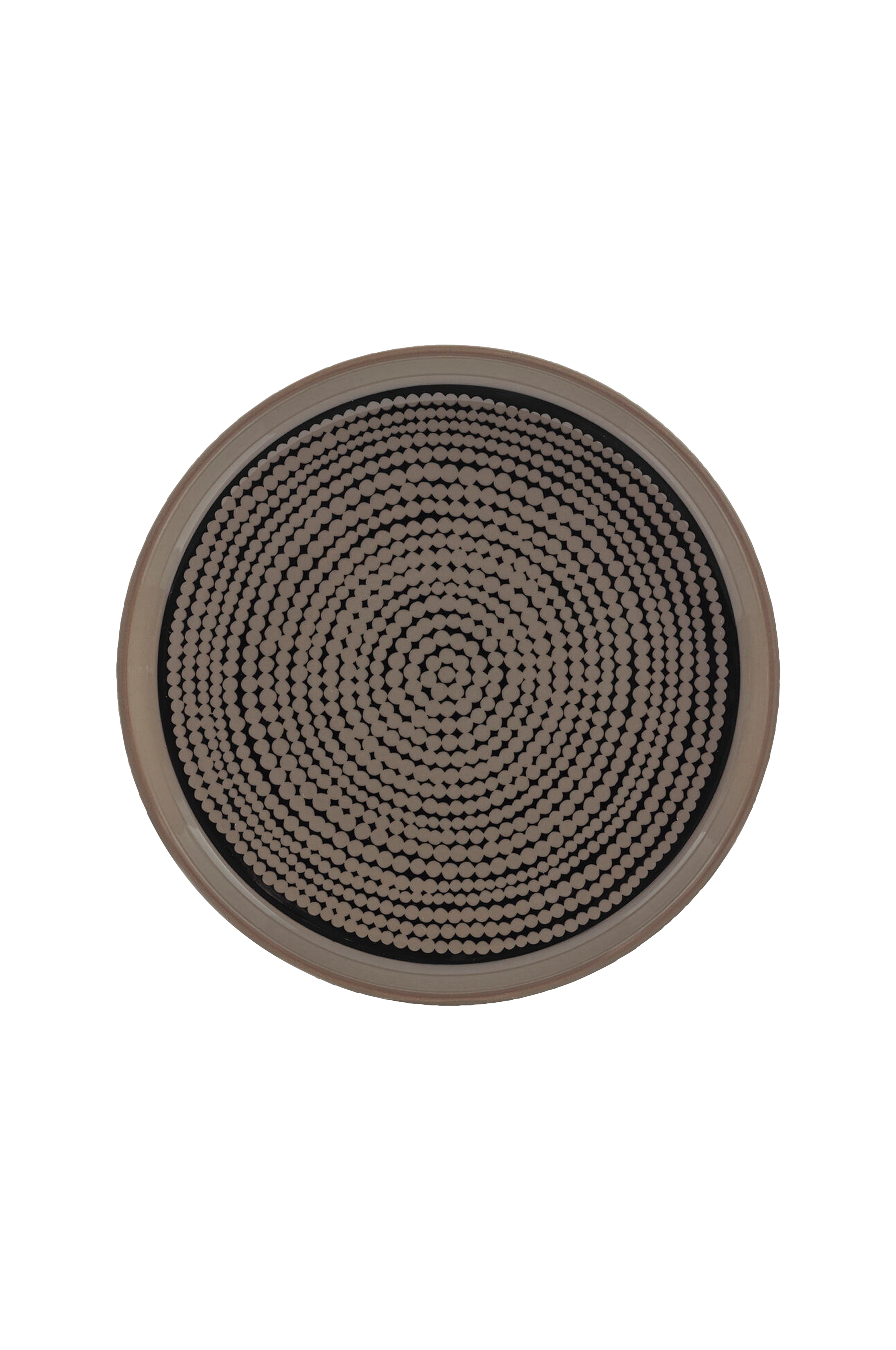 En større asiet designet af Maija Louekari. Tallerkenen er lavet af stentøj og er dekoreret med de klassiske Räsymatto prikker i sort og hvid. Ø 13,5 cm.