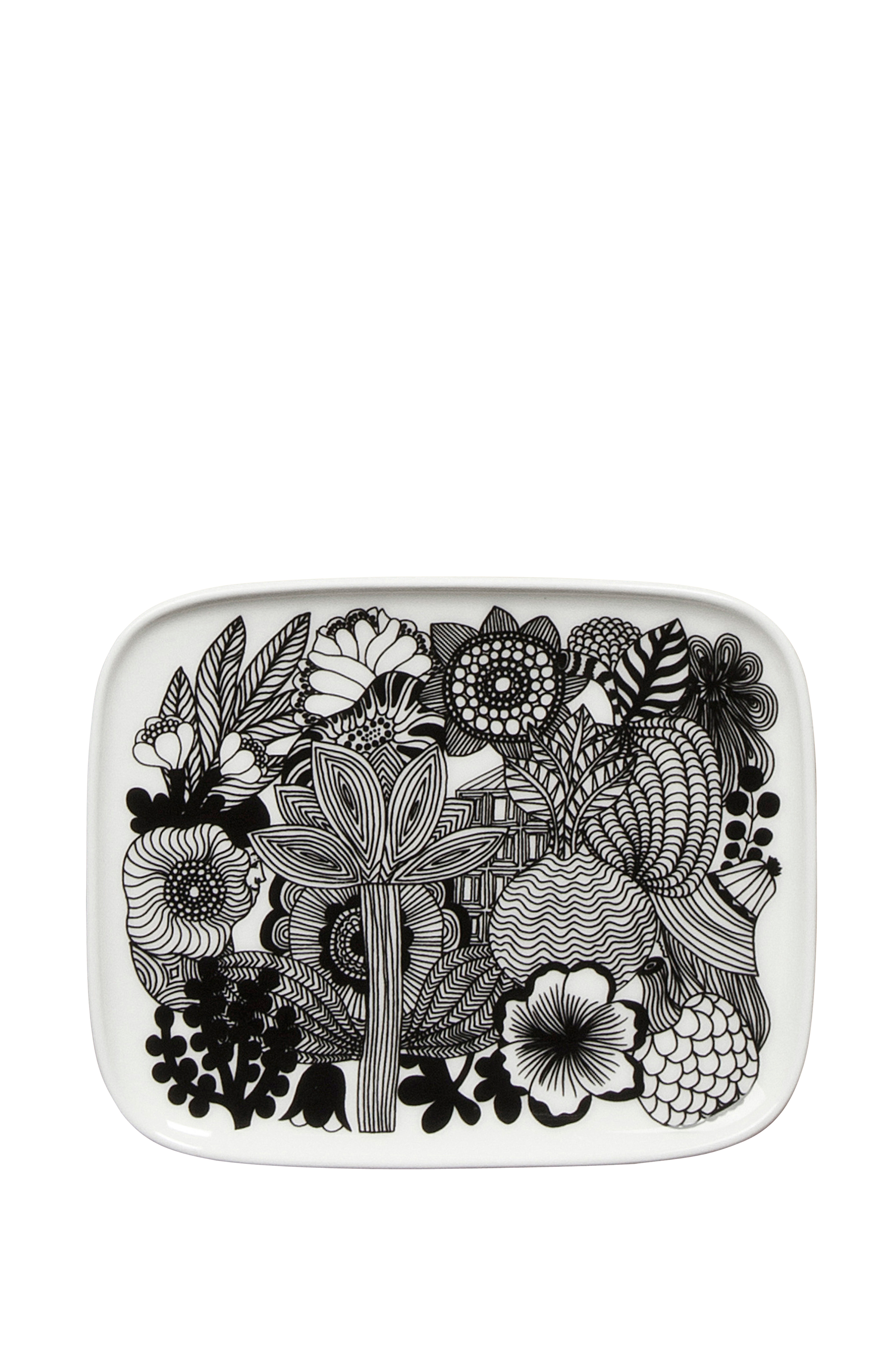 Lille rektangulær tallerken i hvidt stentøj med smukt blomstermønster. Tåler maskinopvask, mikrobølgeovn og fryseskab. De glaserede farver og mønsteret beholder farven.