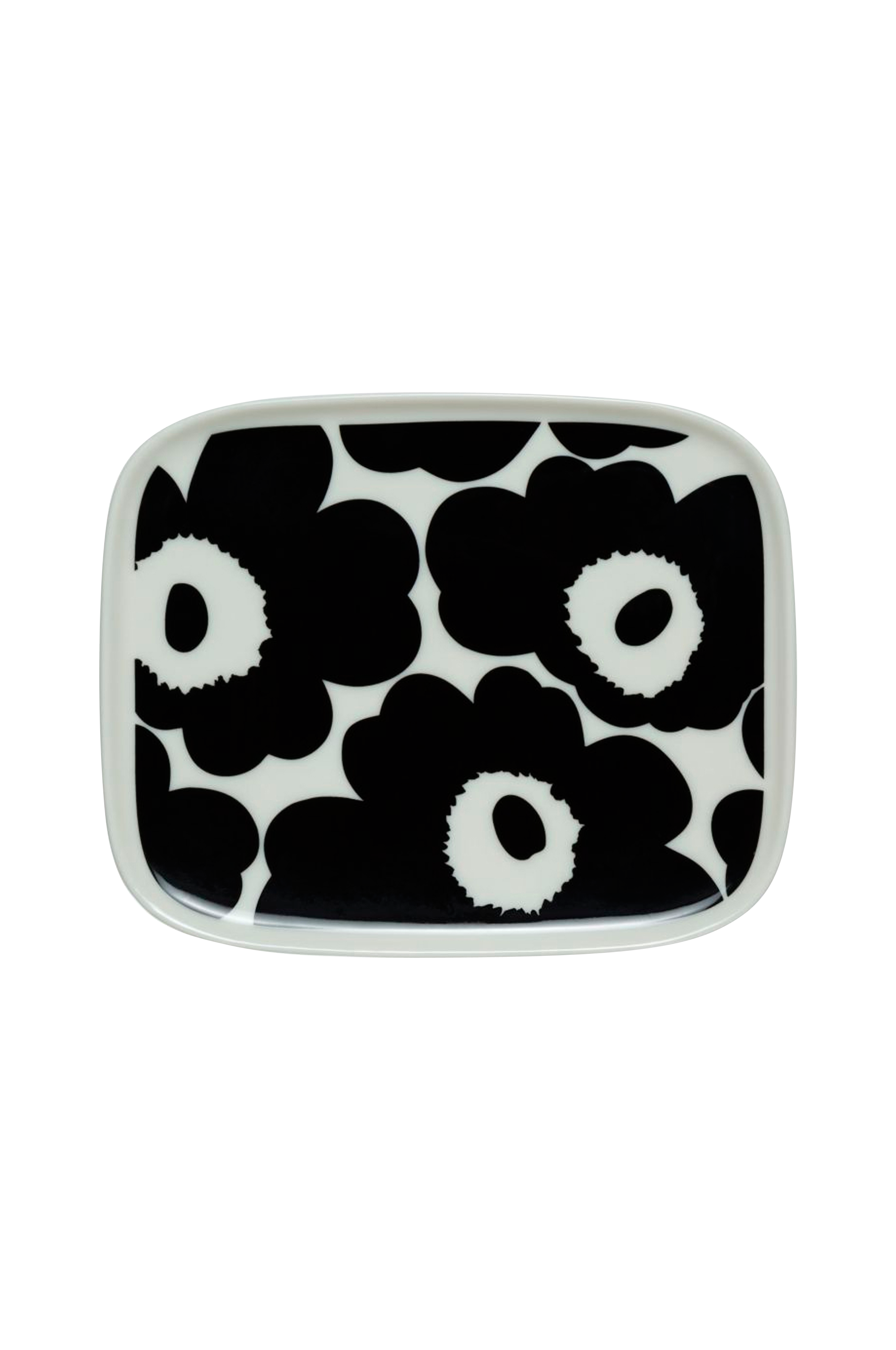 Rektangulær tallerken Oiva i hvid stentøj med mønstret Unikko (valmue). Tåler opvaskemaskine, ovn, mikrobølgeovn og fryser.