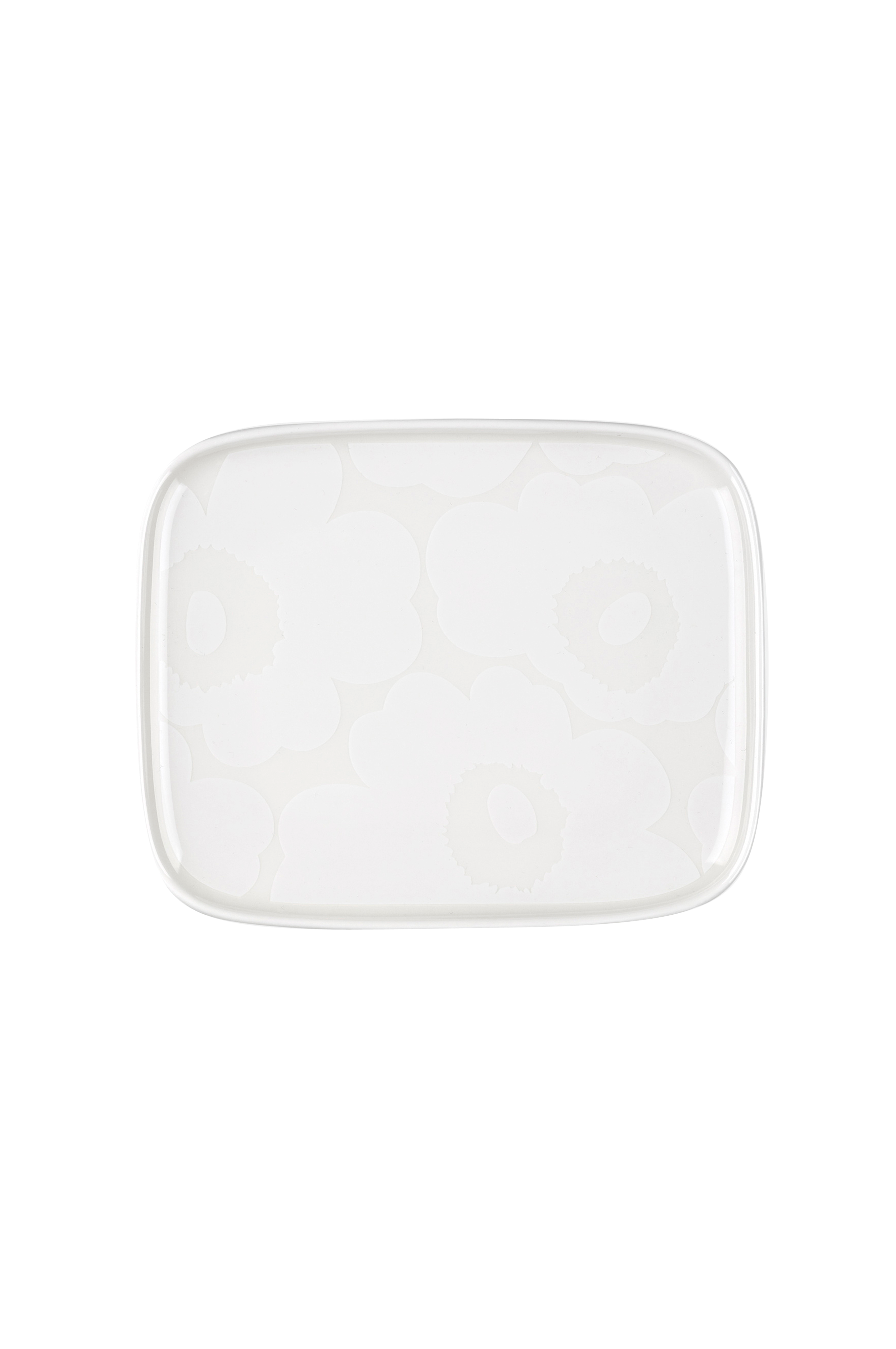Den rektangulære Oiva-tallerken er lavet af hvidt stentøj, der tåler opvaskemaskine, ovn, mikroovn og fryser.