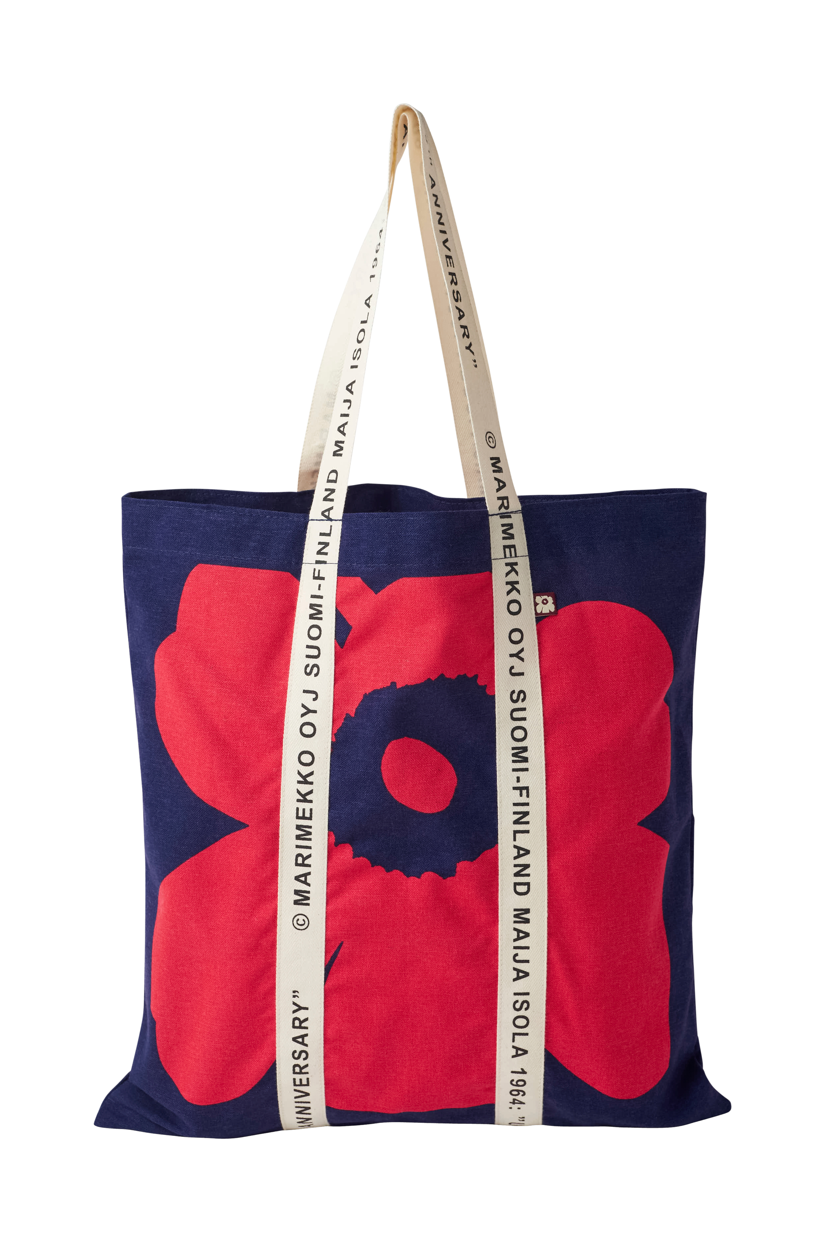 Carrier Midi tote bag er lavet af en ubleget bomulds- og hørblanding i Unikko -mønsteret, som er trykt i Helsinki. De "Marimekko Kioski"-trykte bomuldsstropper løber langs taskens sider og danner håndtagene. Dette produkt indeholder 46 % genanvendt bomuld og 21 % genanvendt hør.