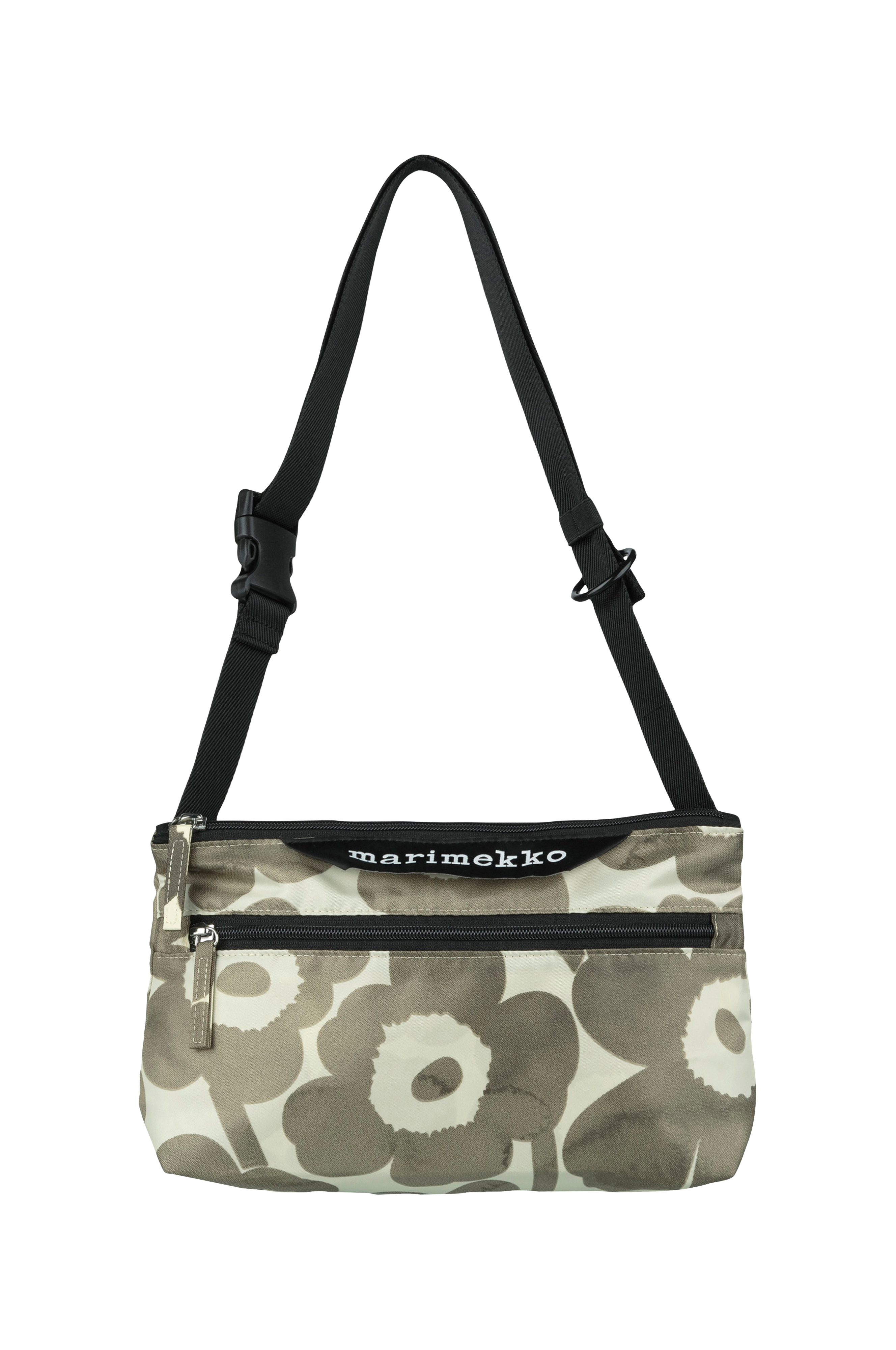 Skuldertasken Neat Crossbody S er i mønsteret Unikko. Tasken har en justerbar skulderrem, der er lavet af genanvendt polyamid. Den lille taske lukkes med lynlås, har en lynlåslomme og Marimekko-mærket på forsiden og en indvendig lomme, hvor hele tasken kan foldes sammen, så den er nem at opbevare.