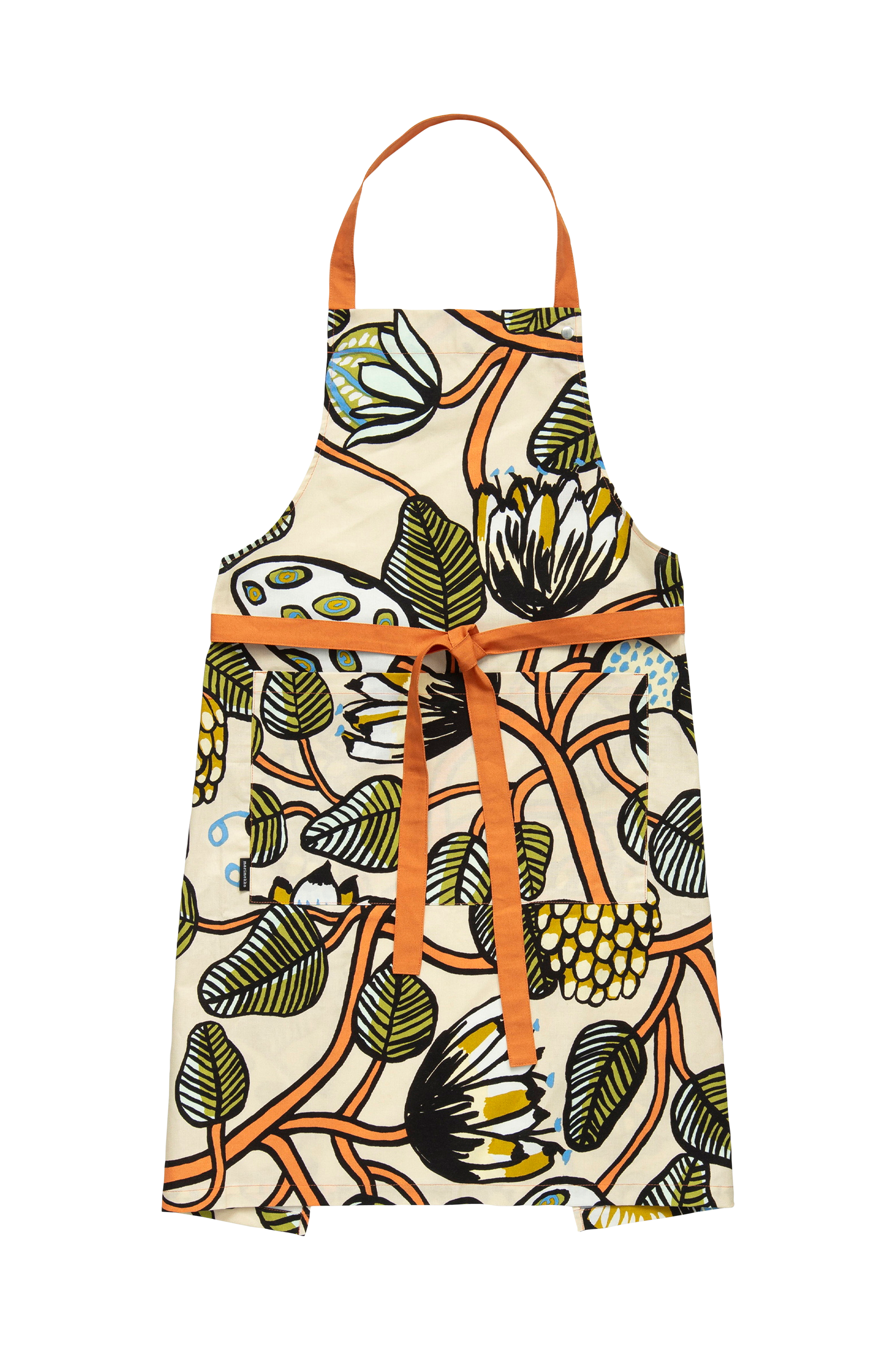 Forklædet med Tiara -mønster er trykt i Helsinki. Det har en lomme foran og et justerbart nakkebånd. Forklædet er lavet af 100 % økologisk bomuld. I det sprudlende Tiara mønster designet af Erja Hirvi ses forskellige slags planter og blomster som naturens kronen på værket.