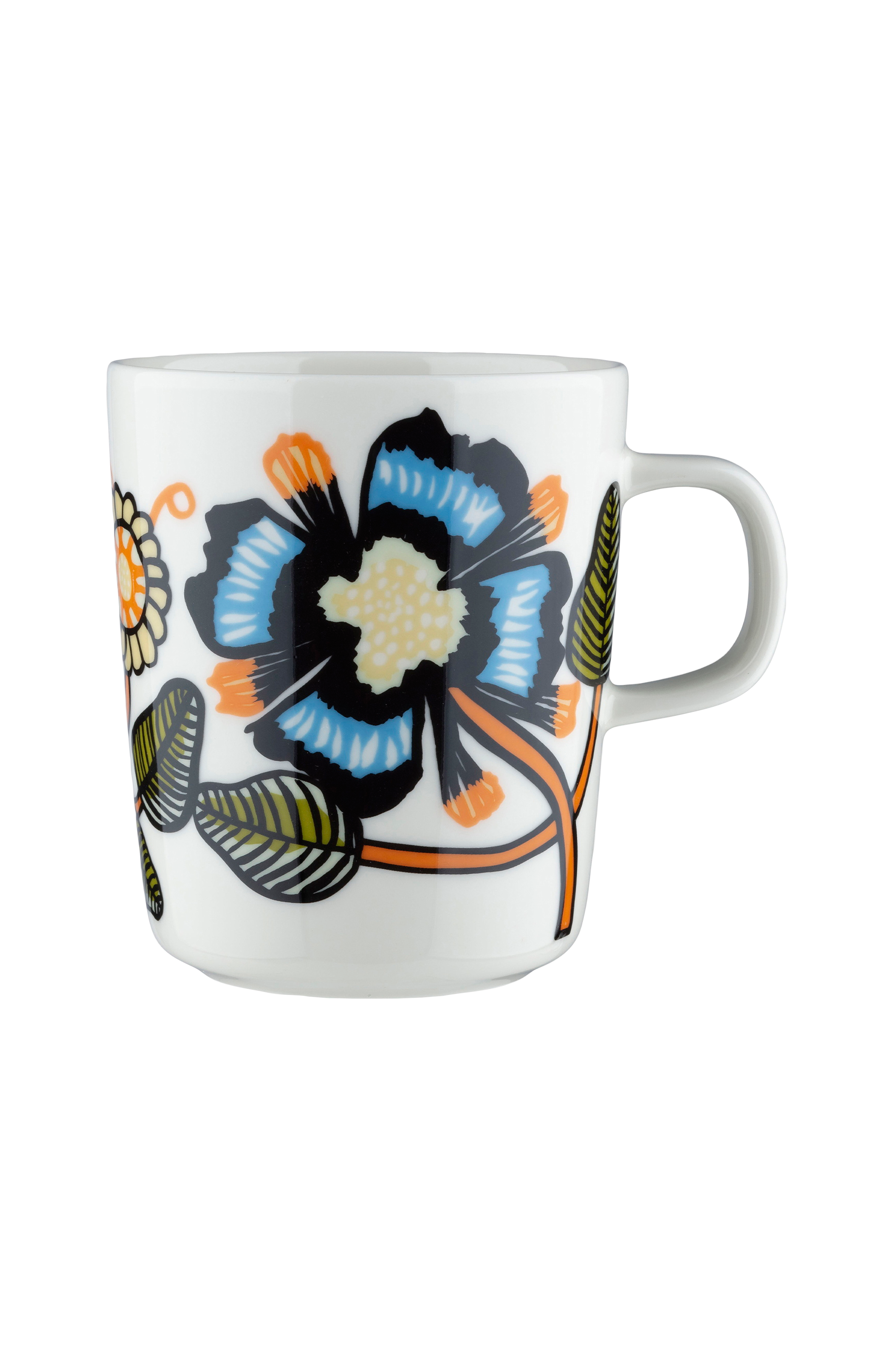 Oiva-kruset med Tiara -mønster tåler opvaskemaskine, ovn, mikroovn og fryser. Kruset er lavet af hvidt stentøj. Oiva-produkterne er designet af Sami Ruotsalainen. Fjern venligst klistermærket fra bunden af produktet før brug. Klistermærket indeholder en lille smule metal. I det sprudlende Tiara -mønster designet af Erja Hirvi ses forskellige slags planter og blomster som naturens krone på værket.