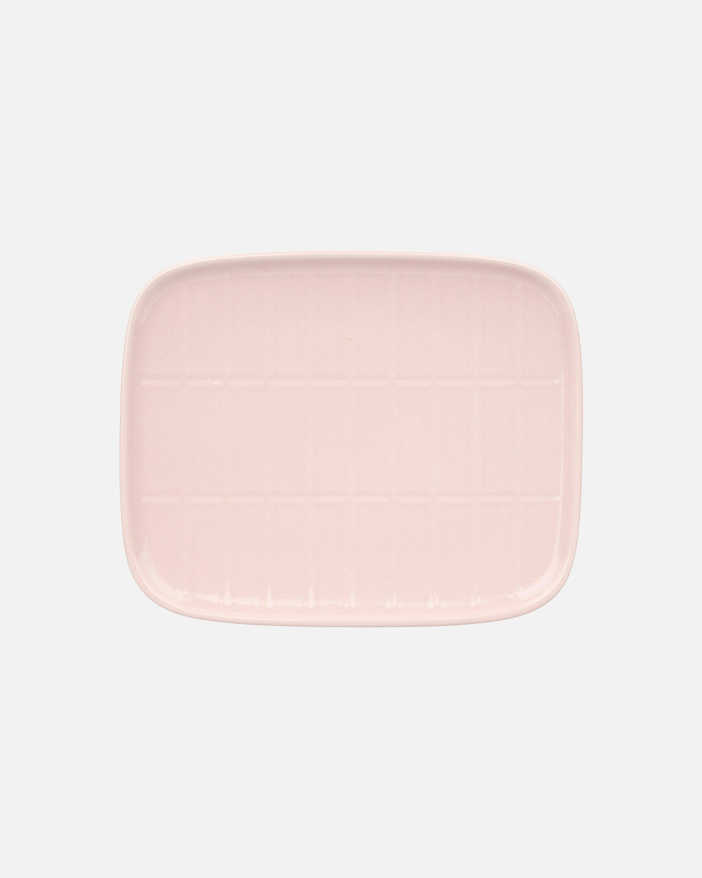 Den rektangulære Oiva plate er lavet af hvidt stentøj, der tåler opvaskemaskine, ovn, mikroovn og fryser. plate har Tiiliskivi -mønsteret lavet med en reliefteknik.