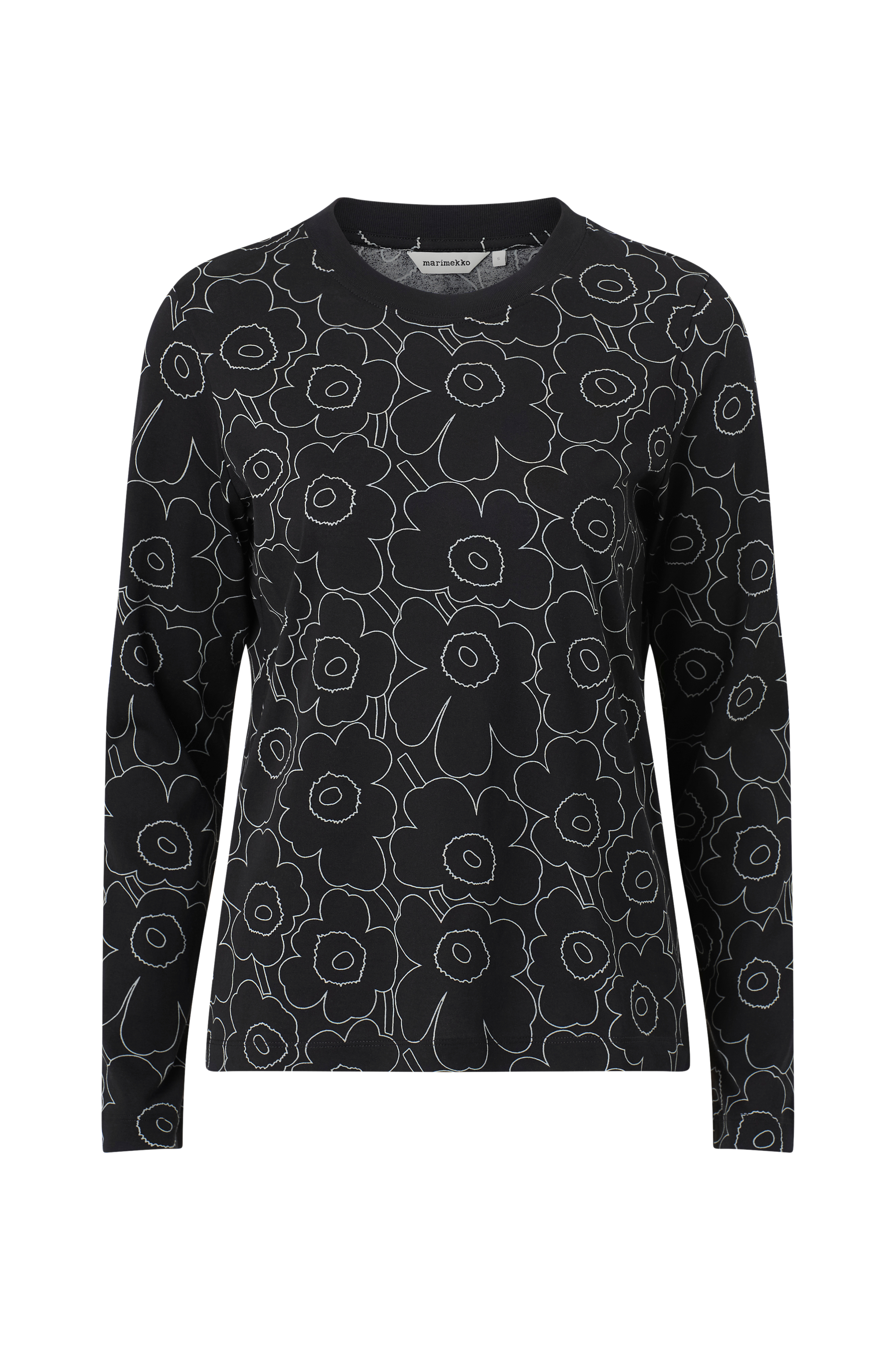 Sekunti toppen er lavet af økologisk bomuldsjersey og har en slank, lige pasform. Den langærmede top har det hvide Piirto Unikko mønster og en ribbet O-hals.