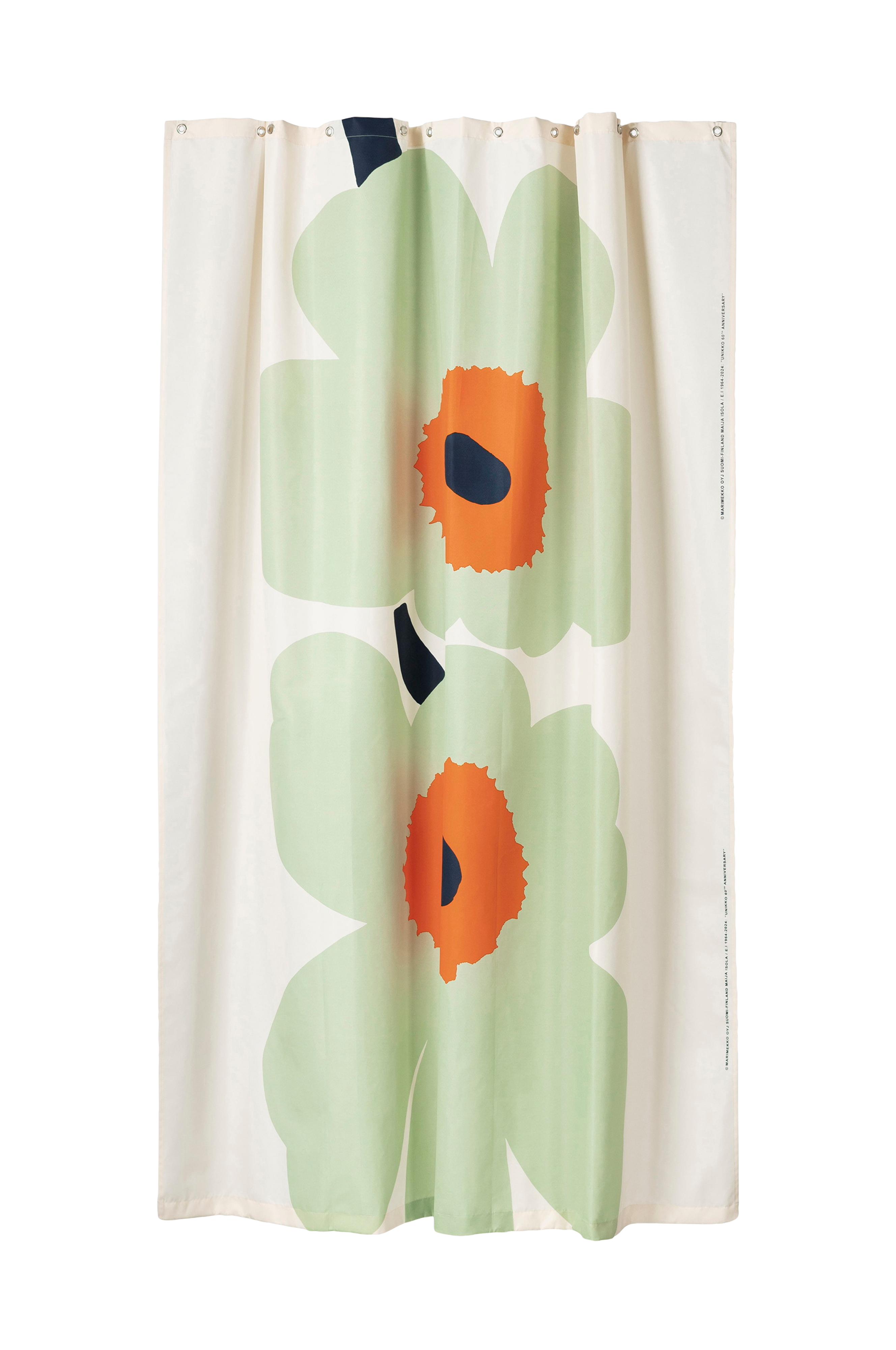 Juhla Unikko mønsterbruseforhæng er lavet af genbrugspolyester. Bruseforhænget kan hænges op med brusekroge i de 12 små metalringe i den øverste kant. Forhænget har en vægtet underkant. Brusekrogene medfølger ikke. Dette produkt fejrer 60-års jubilæet for mønsteret Unikko.