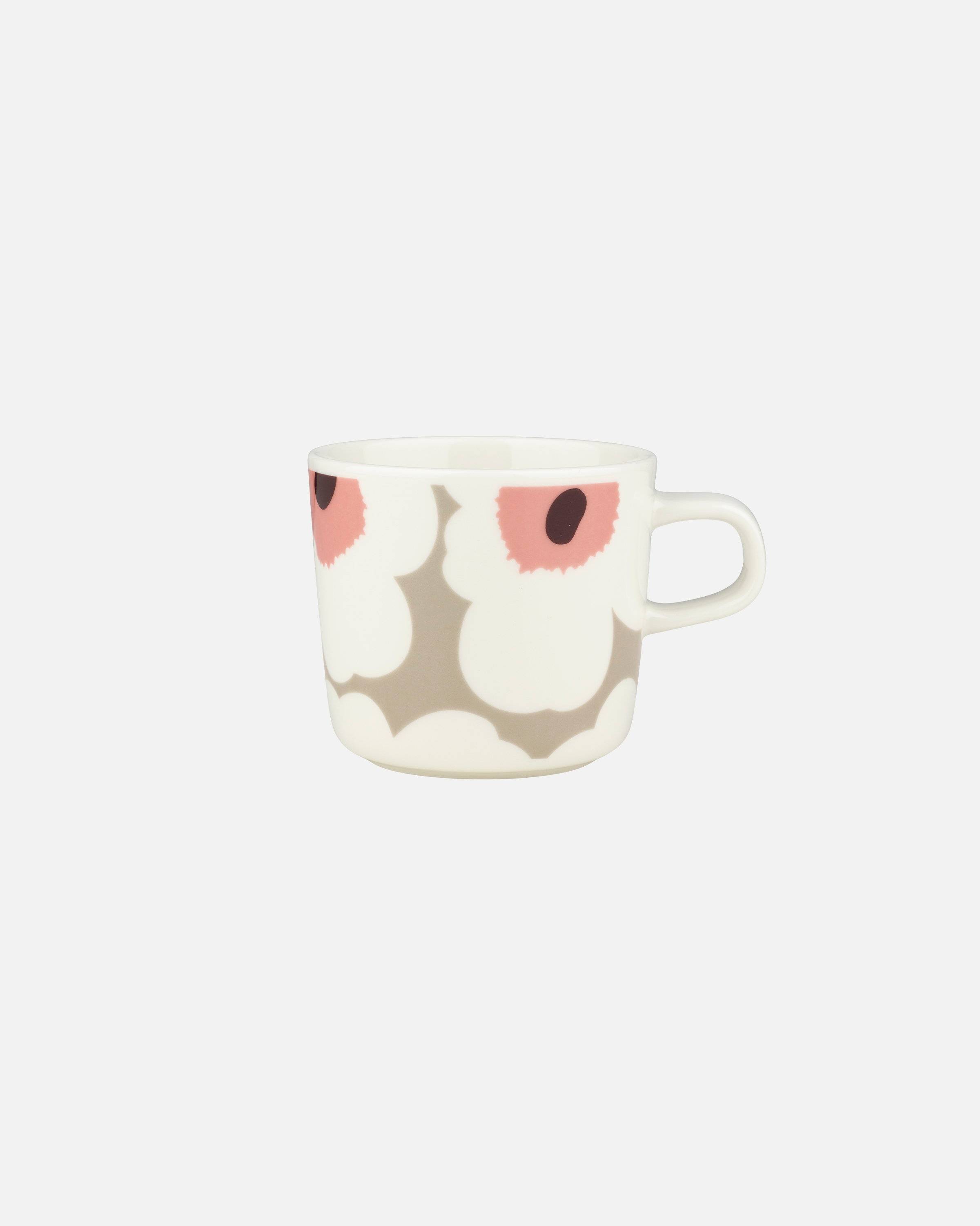 Oiva-kruset med Unikko -mønster er lavet af hvidt stentøj, der tåler opvaskemaskine, ovn, mikroovn og fryser.