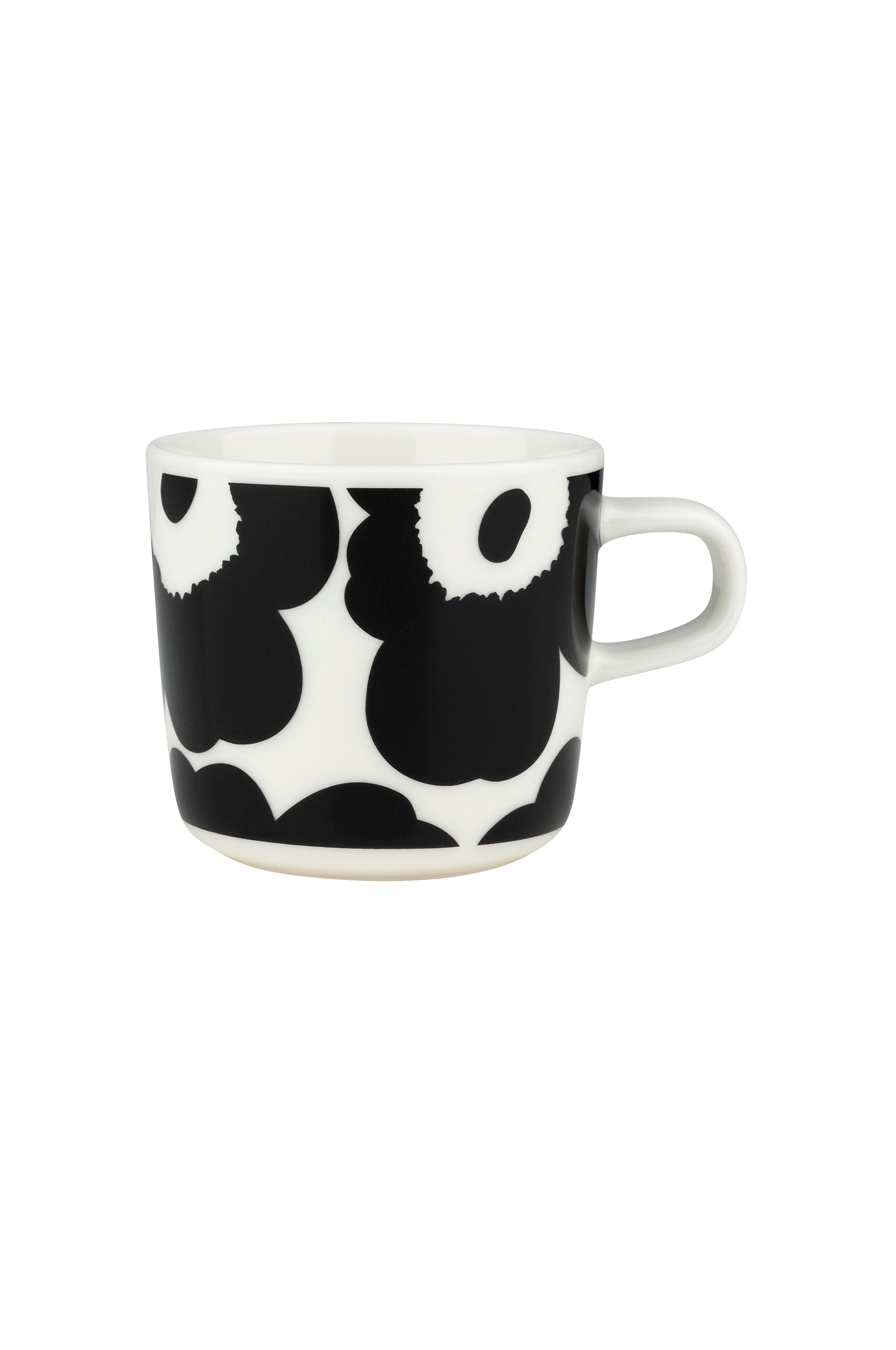 Oiva-kruset med Unikko -mønster er lavet af hvidt stentøj, der tåler opvaskemaskine, ovn, mikroovn og fryser.