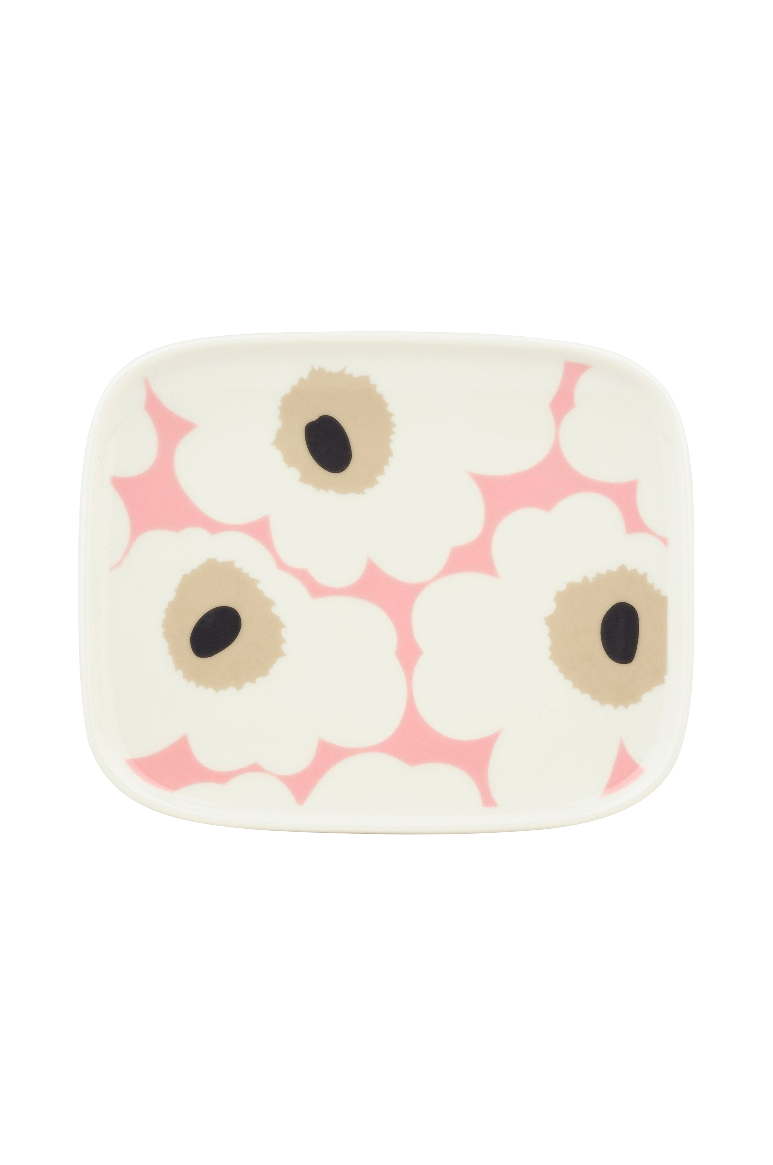 Den lille rektangulære Oiva plate med Unikko mønster er lavet af hvidvarer, der tåler opvaskemaskine, ovn, mikroovn og fryser.