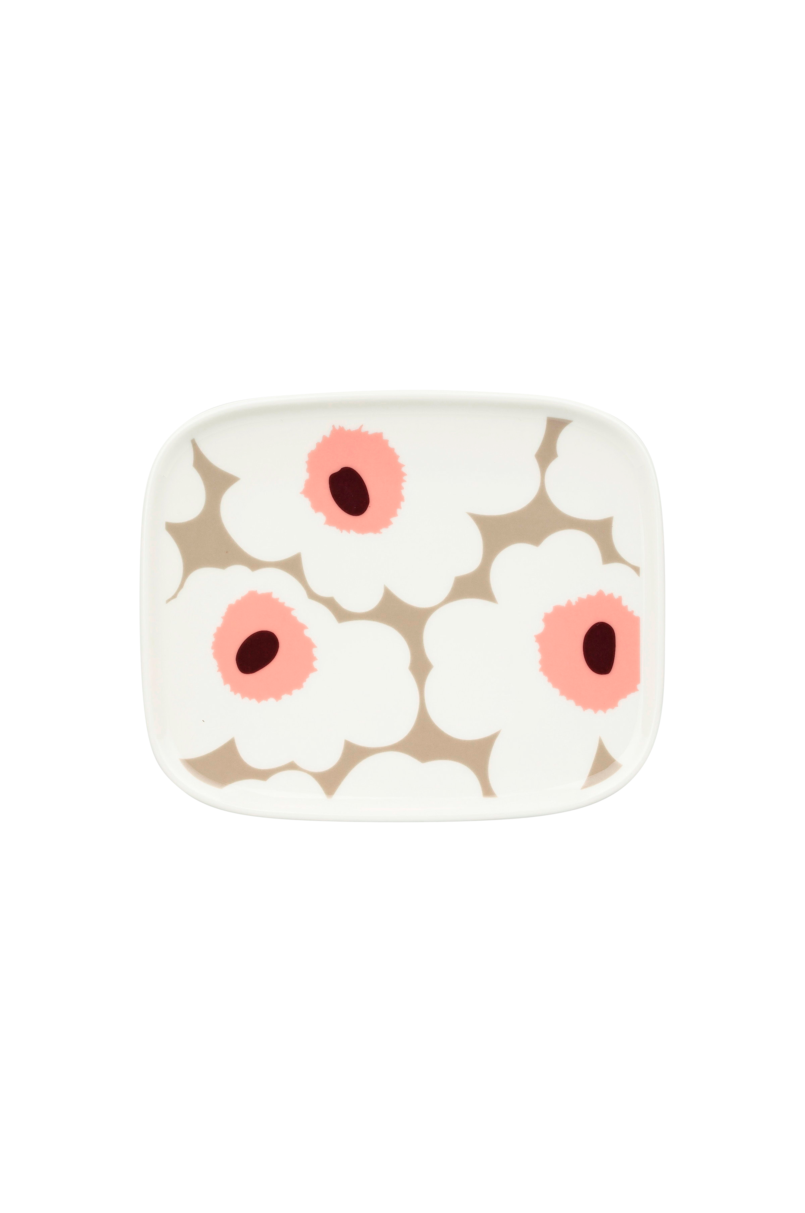 Den lille rektangulære Oiva plate med Unikko mønster er lavet af hvidvarer, der tåler opvaskemaskine, ovn, mikroovn og fryser.