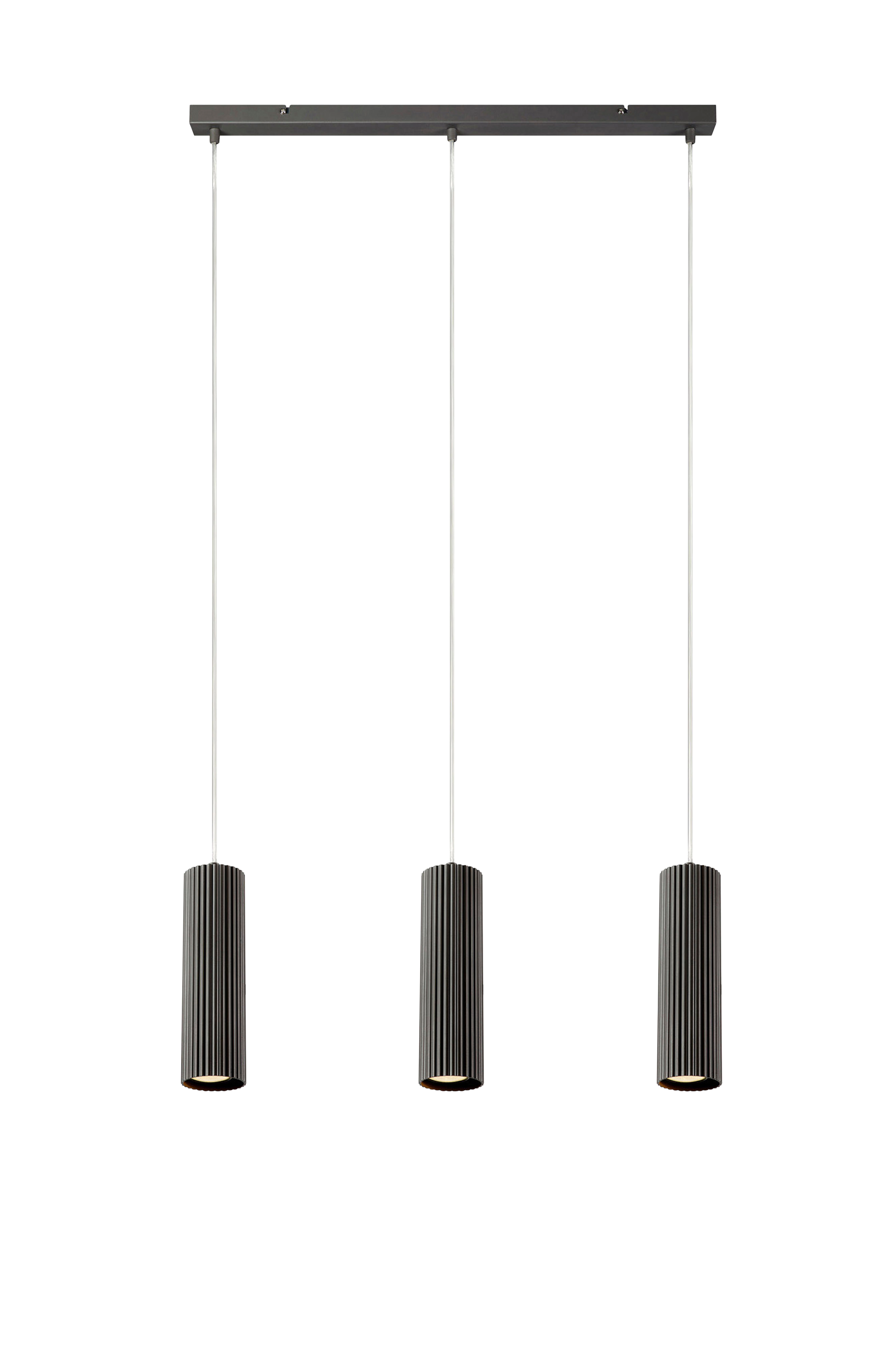 Costilla loftlampe fra Markslöjd. Loftskinne og de rillede skærme helt i metal. 1,5 meter PVC-ledninger. Tilpas længderne ved at trække kablet ind i loftskinnen. Fast installation/Loftbøjle. 3xGU10 sokkel, maks. 7W LED. Pærer medfølger ikke.