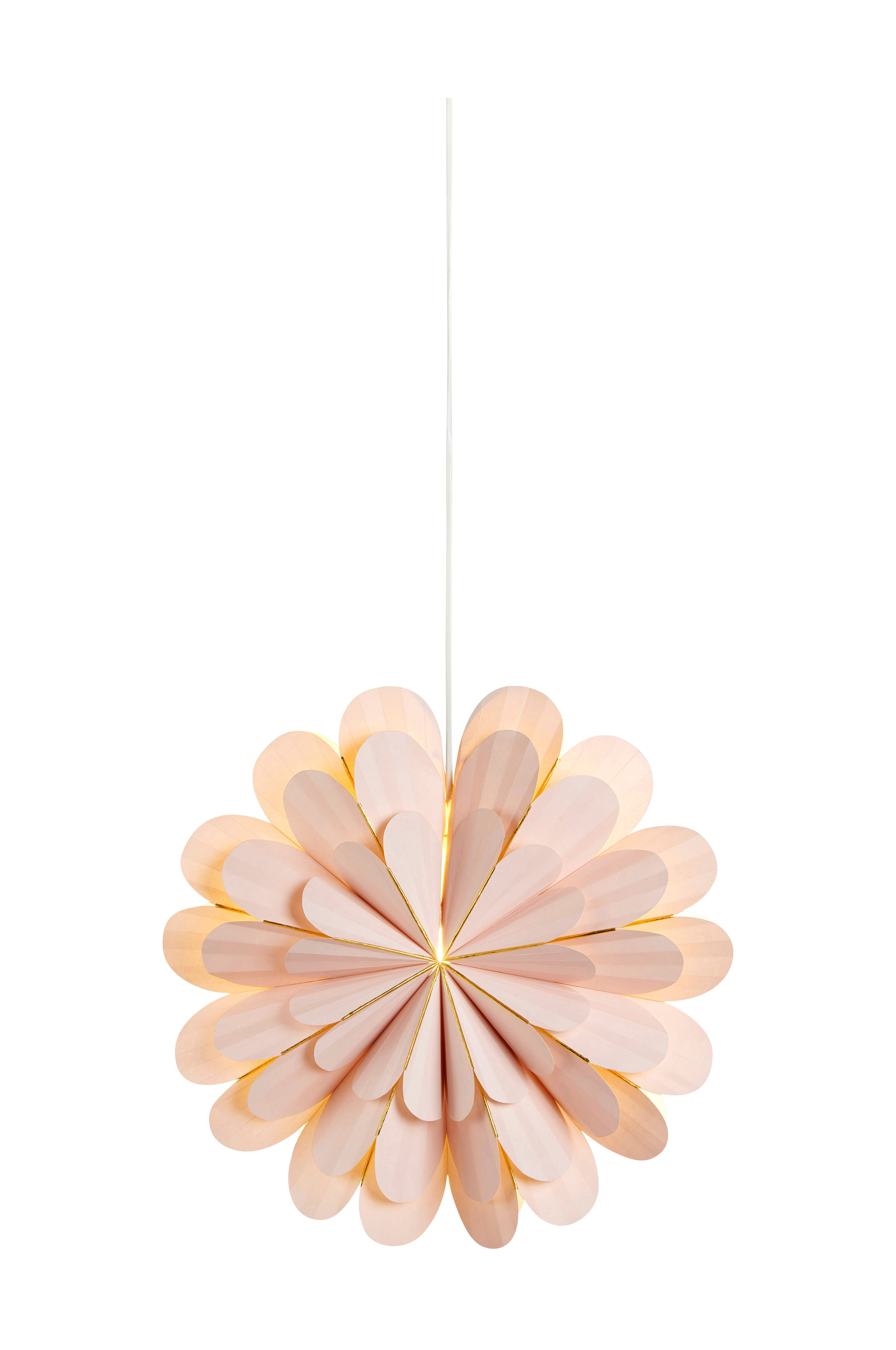 Pendel med skærm i papir i blomsterfacon. Diameter 45 cm og dybde 19 cm. Det foldede papir giver et smukt lysskær. Lyskilden skal have lille sokkel (E14) på maks. 25 W eller tilsvarende i LED, medfølger ikke. 3,5 meter lang ledning med afbryder.