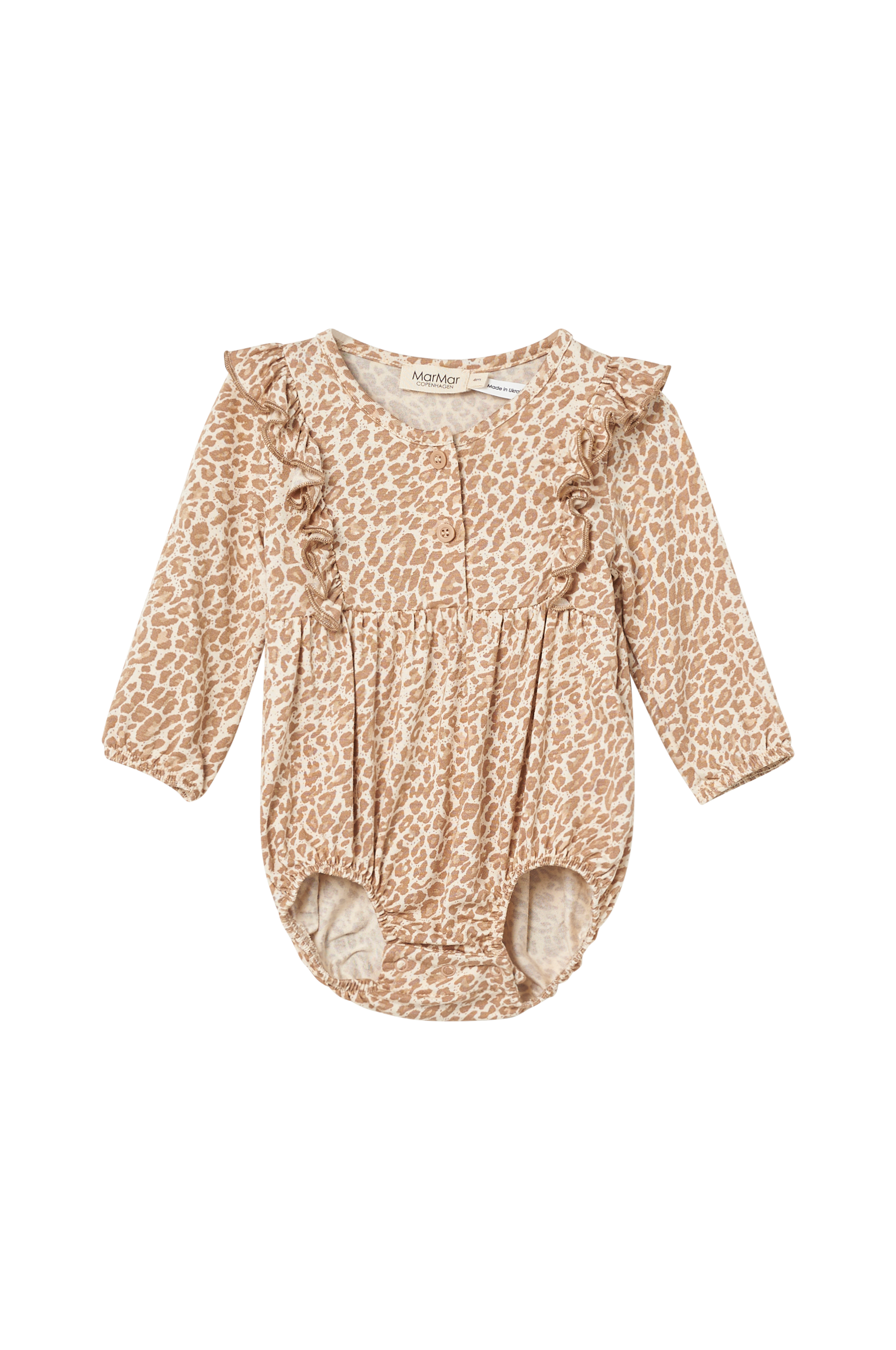• Body i viskosejersey • Lange ærmer med elastiske manchetter • Volanter på skuldrene • Knapper oppe foran • Elastiske benåbninger • Trykknapper ved skridtet • Produktet er certificeret i henhold til STANDARD 100 by OEKO-TEX®. Certificeringen garanterer, at produktet er testet og fri for stoffer, som kan være sundheds- og miljøskadelige. Licensnummer og testinstitut: 84916 DTI